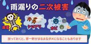 二次災害の例として、木材の傷み、シロアリなどの発生による害虫被害、カビの発生、漏電など、多くの被害を被る危険性があります。