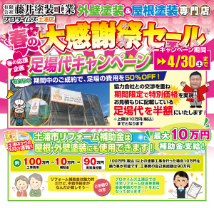 。.。・.。*゚>。。.。・.。*゚>。。.。・.。*゚>。。.。・.。*゚>。。.。・.。*゚ スタッフブログをご覧いただきありがとうございます。 土浦市・つくば市を中心に塗装工事を行っております。 地域密着 土浦市周辺で1800棟以上の施工実績!! プロタイムズ土浦店 有限会社藤井塗装工業です。 。.。・.。*゚>。。.。・.。*゚>。。.。・.。*゚>。。.。・.。*゚>。。.。・.。* 皆様、こんにちは。 少しずつ暖かくなり春らしさが感じられる頃となりました! いかがお過ごしでしょうか?   日頃よりご愛顧いただいている皆様に感謝の気持ちとして 4月1日より 「春の大感謝祭セール」 を開催いたします! 今回の大感謝祭セールでは豪華特典をご用意いたしております! ご成約特典として 塗装工事・屋根カバー工事のお客様には足場代を半額!! (※上限は10万円(税込み)) 期間中だけの豪華特典となっております(^^)   お家で過ごす時間が増えた昨今、安心して大切なお家に住み続けられるように、お話だけでも一度聞きにいらっしゃいませんか? キャンペーン期間は4月1日~4月30日までとなっておりますのでお早めのお申込みをお待ちしております!     また、土浦市のお住いの方必見!! 毎年大人気の 土浦市リフォーム助成金 が今年も支給されることになりました!! 10万円(税込)以上のリフォーム工事費に対し、 最大10万円の補助金が支給されます。 4月20日㈬~受付開始になります!! 助成金の受付が開始されてからでのお見積の依頼では、申請が間に合わなくなる場合もでてきますので、お早めに準備物のご用意をしていただいた方が良いですね✐申請書等は弊社でお作り致します。   弊社では、無料で現場調査を行い、お見積書も作成させていただいておりますので、お気軽にご連絡下さいね。 塗装工事をするか悩んでいる方は、この機会に是非、ご検討してみて下さい。 詳細については、以前、HPに掲載させていただいたものを載せておきますね。下記をクリックしてご確認ください。 土浦市助成金について✐ | プロタイムズ土浦店 (protimes-tsuchiura.com/cms)     。.。・.。*゚>。。.。・.。*゚>.。・.。*゚>。。.。・.。*゚>。。.。・.。*゚ 最後までご覧いただきありがとうございます。 不明な点がございましたらお気軽にご相談ください。 お電話番号はこちら↓↓ 0120-441-164 土浦市・つくば市での屋根・外壁塗装工事なら プロタイムズ土浦店で決まり❗❗ 。.。・.。*゚>。。.。・.。*゚>。。.。・.。*゚>。。.。・.。*゚>。。.。・.。*゚
