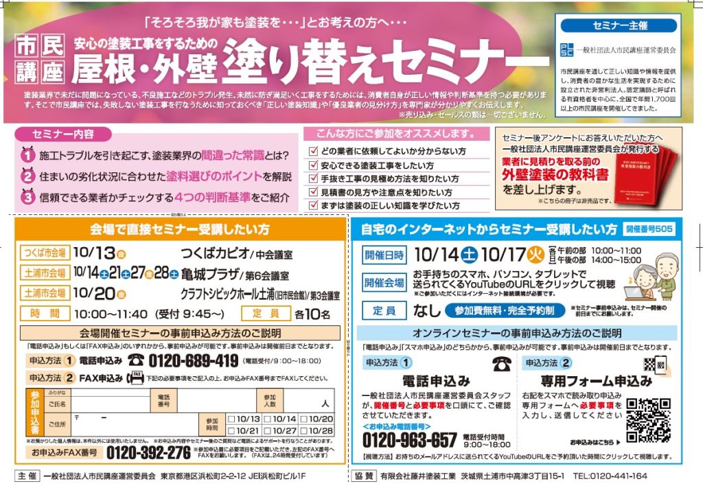 一般社団法人市民講座運営委員会の主催で行いますが、会場開催の塗り替えセミナーでは、弊社、プロタイムズ土浦店 藤井塗装工業の取締役(藤井浩)が講師としてお話させて頂きます。