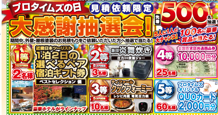 この度、全国に238店舗を展開し弊社も加盟している「プロタイムズ」の主催で、景品総額111万円!100名様に当選のチャンス!!
