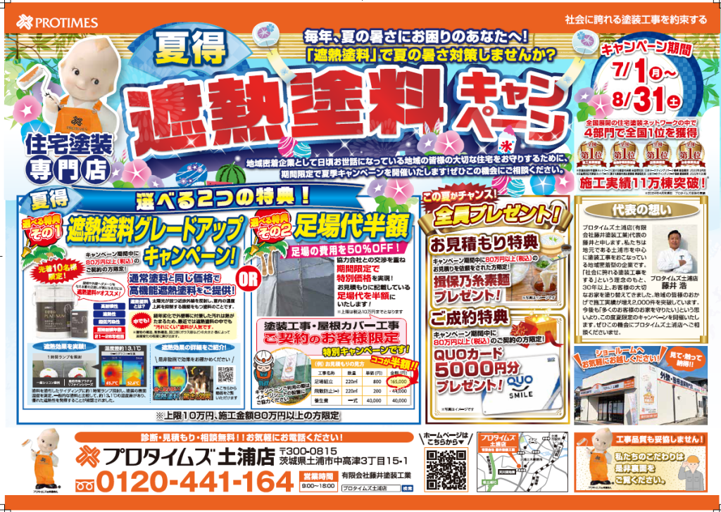 土浦市・つくば市・阿見町を中心に、外壁塗装・屋根塗装でお世話になっております、プロタイムズ土浦店です。