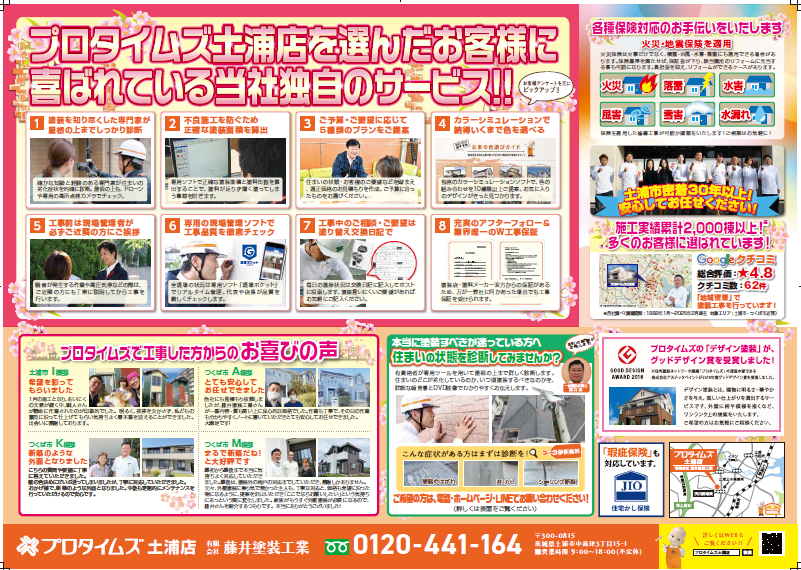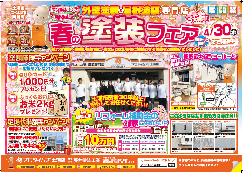 土浦市・つくば市・阿見町を中心に、外壁塗装・屋根塗装でお世話になっております、プロタイムズ土浦店です。