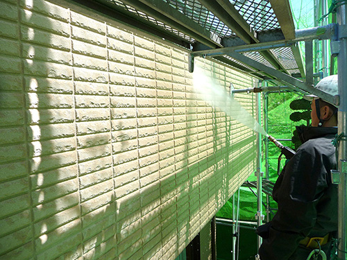 また、足場と同じく外壁塗装に欠かせないのが高圧洗浄です。外壁に汚れやカビ、古い塗膜が残ったままでは、どんな高級塗料を使っても密着せず、数年で剥がれてしまいます。