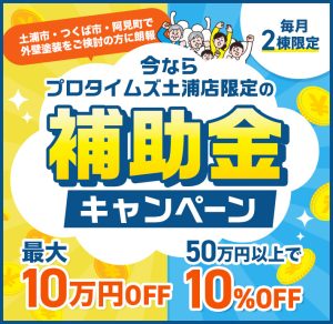 「外壁塗装をしたいけれど費用が心配」「補助金があれば利用したい」とお考えの方に朗報です。プロタイムズ土浦店では、毎月2棟限定で最大10万円OFFの独自補助金キャンペーンを実施しています!