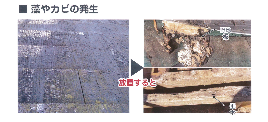 撥水性の低下=水分を含みやすい状態のため、野地板や垂木などの腐食が発生する危険性があります。
