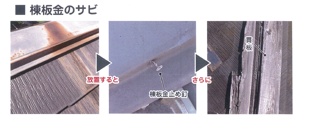 棟板金に錆が発生することにより棟板金止め釘の抜けが発生。