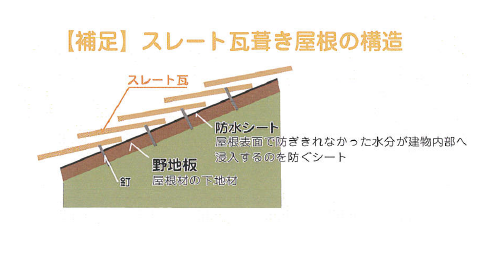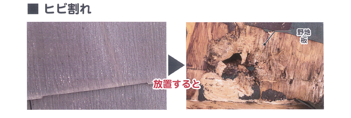 スレート瓦のヒビ割れから水が浸入する危険性があります。ヒビ割れが0.3mm以上ある場合は注意が必要です。