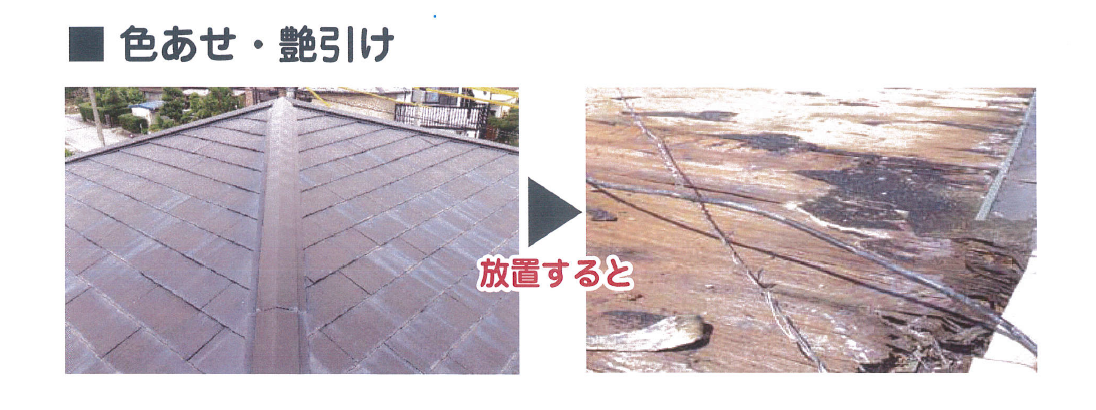 色あせや艶引けは、紫外線や水の影響により塗料の膜が薄くなることで発生する劣化症状です。