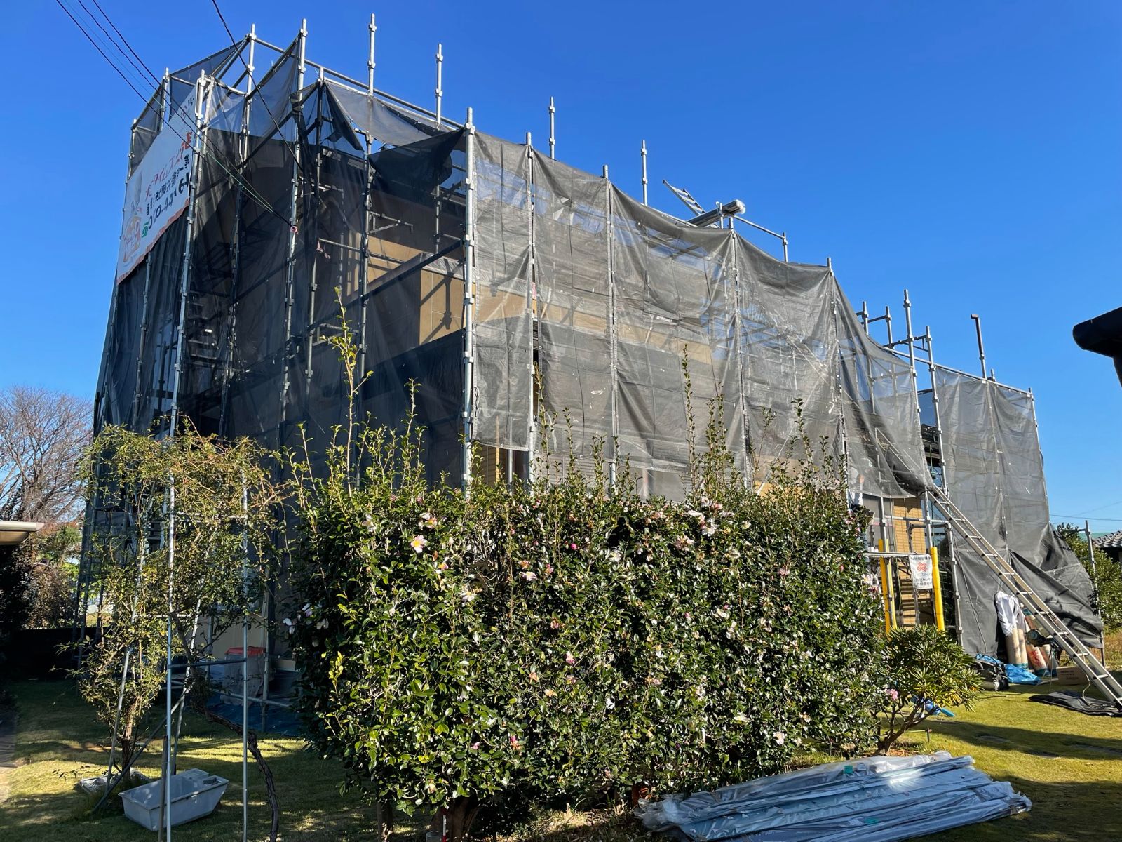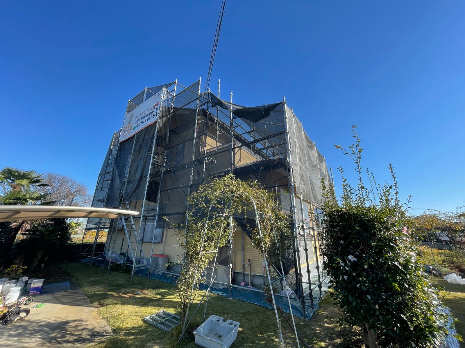 専門の足場業者が組立をします。洗浄水や塗料の飛散を防水するシートをかけて養生します。