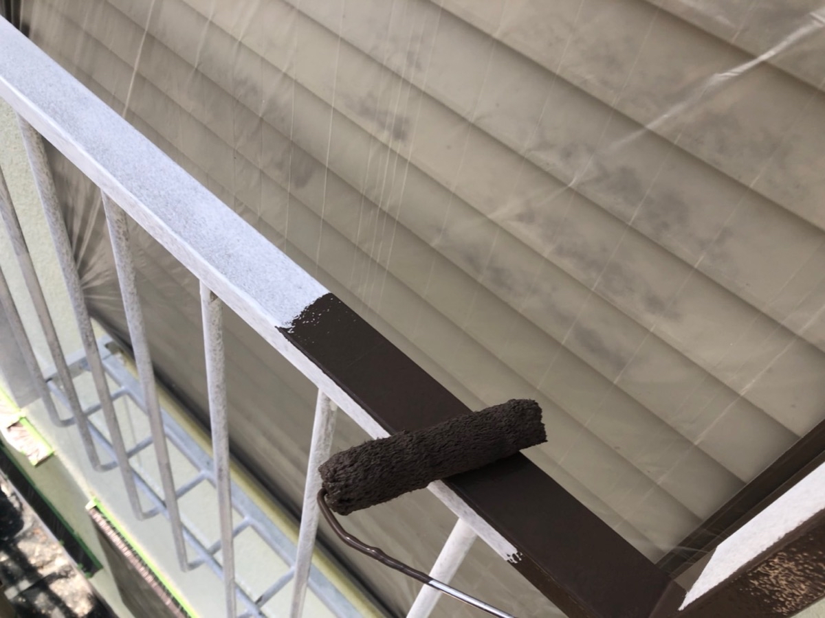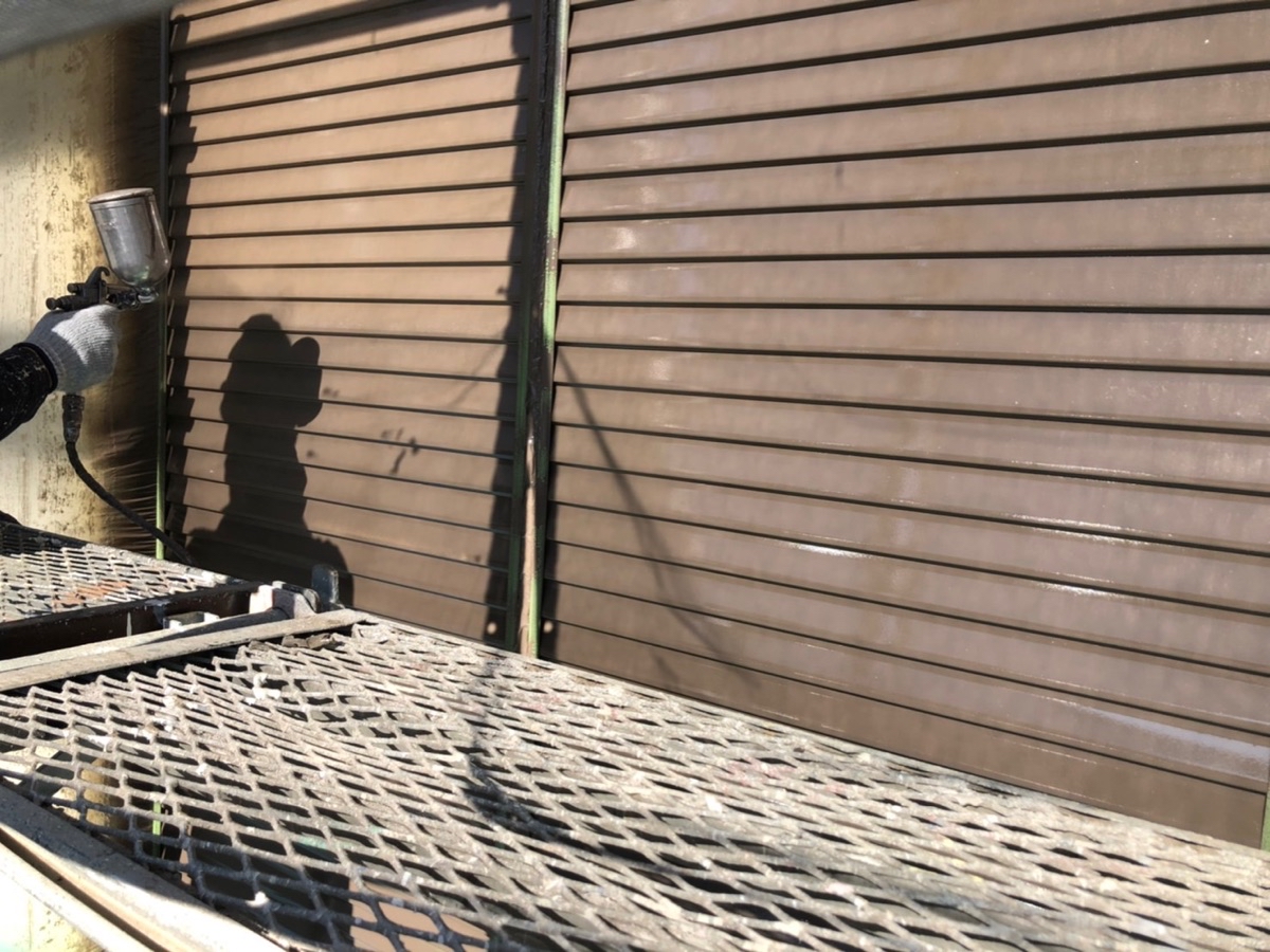 雨戸の下吹きです。複雑な形をした部分には吹き付け塗装で施工します。