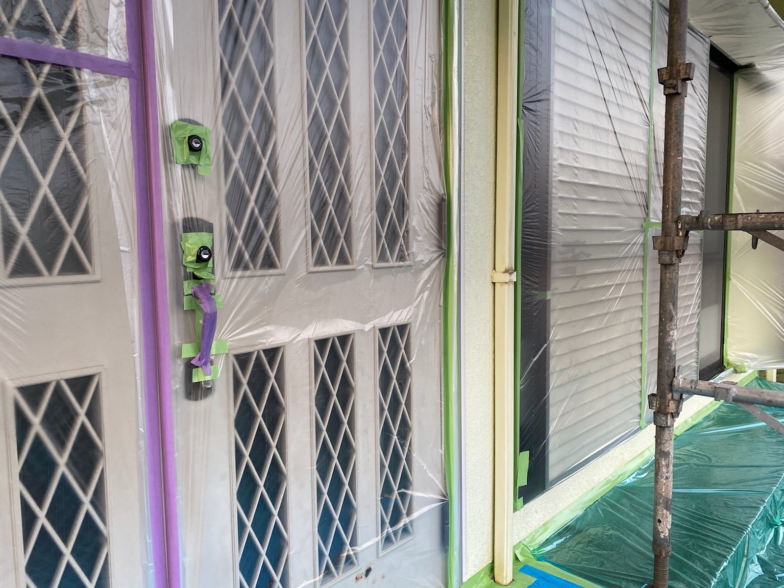 この作業は塗装しない箇所に、特殊なビニールで保護することで汚れないようにする作業です。