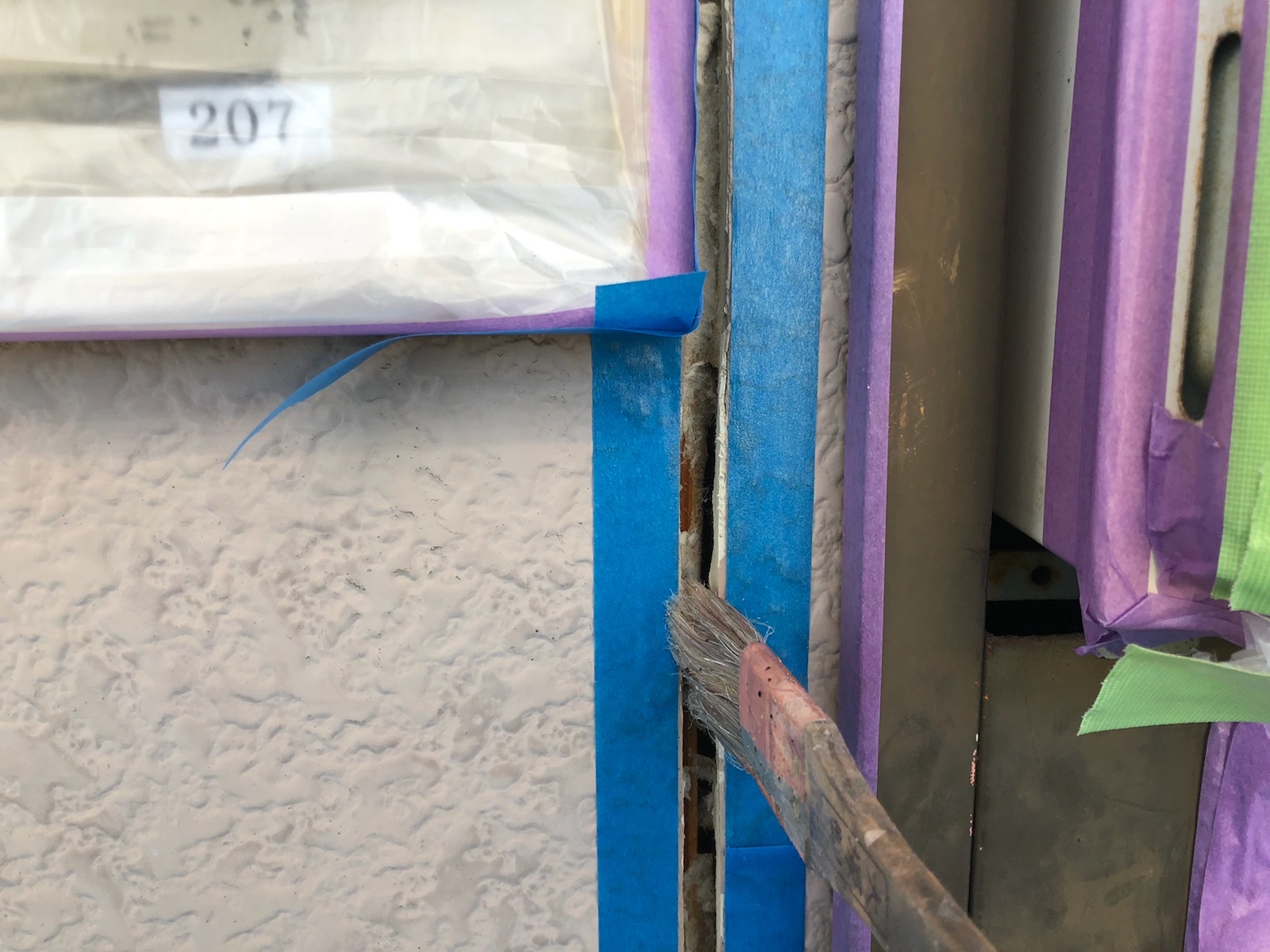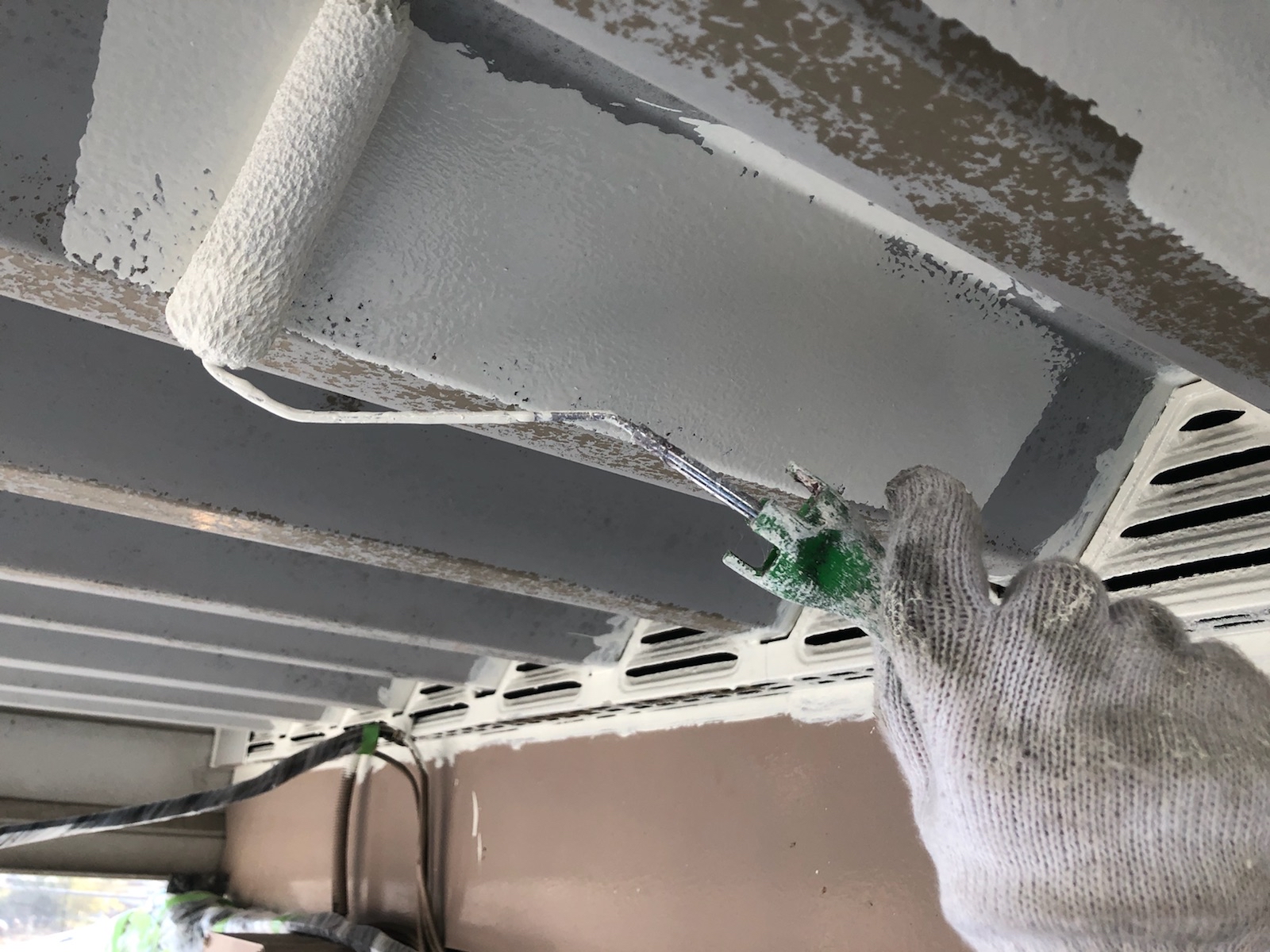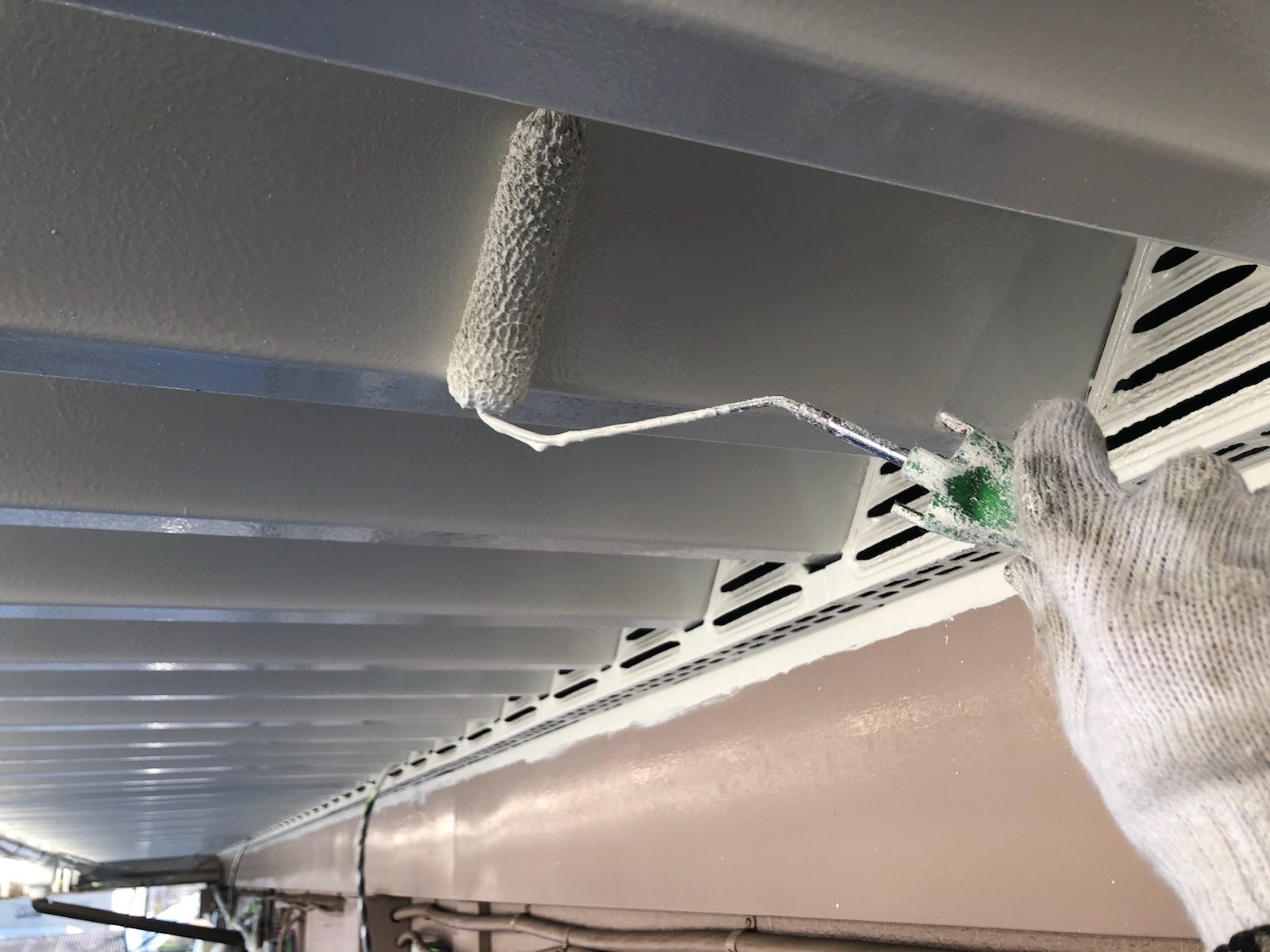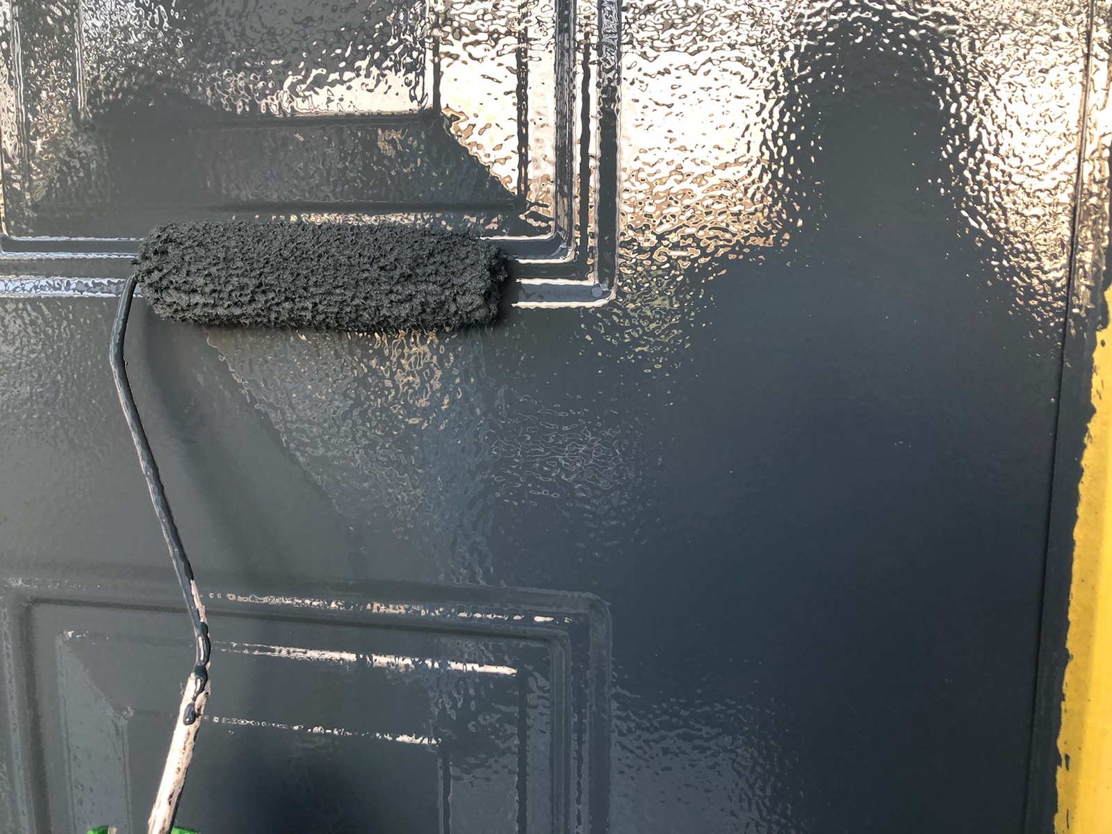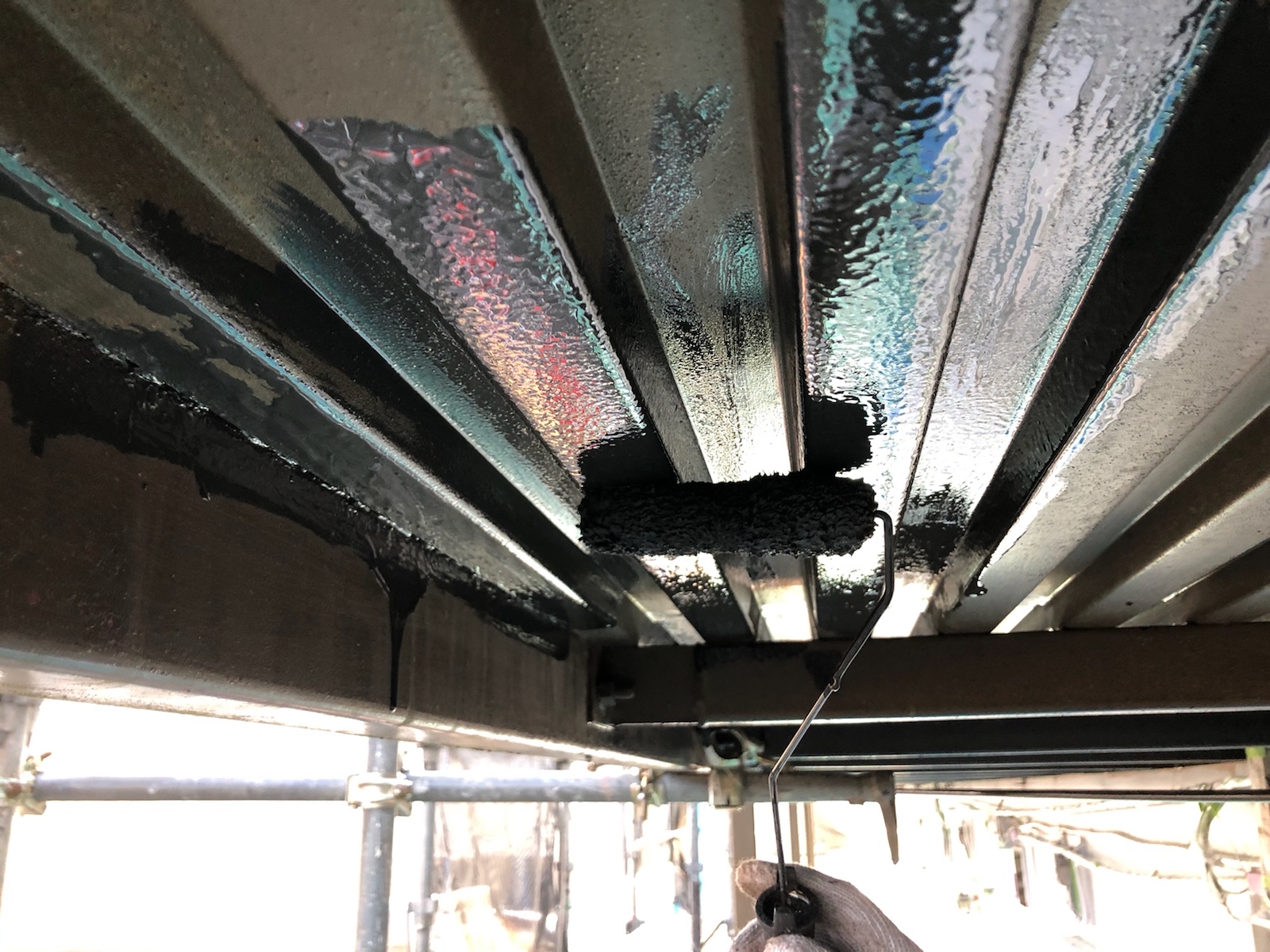 中塗りです。塗料の性能を最大限に発揮する為、基準塗布量や乾燥時間を遵守します。