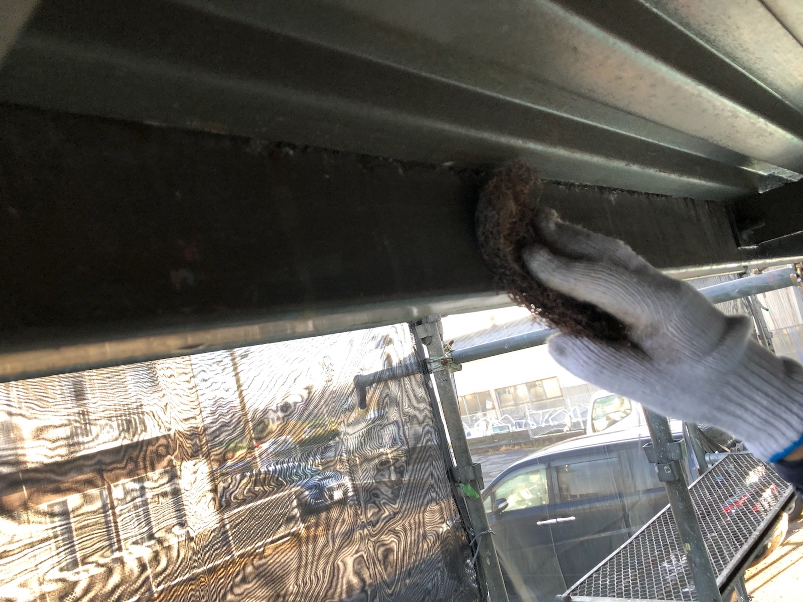 鉄骨部のケレン作業です。古い塗膜や錆びを除去する作業になりますので非常に重要になる下地処理の一つです。
