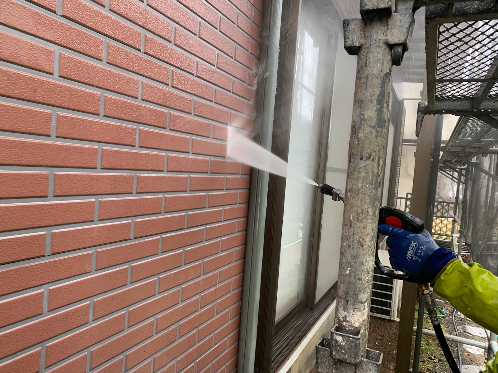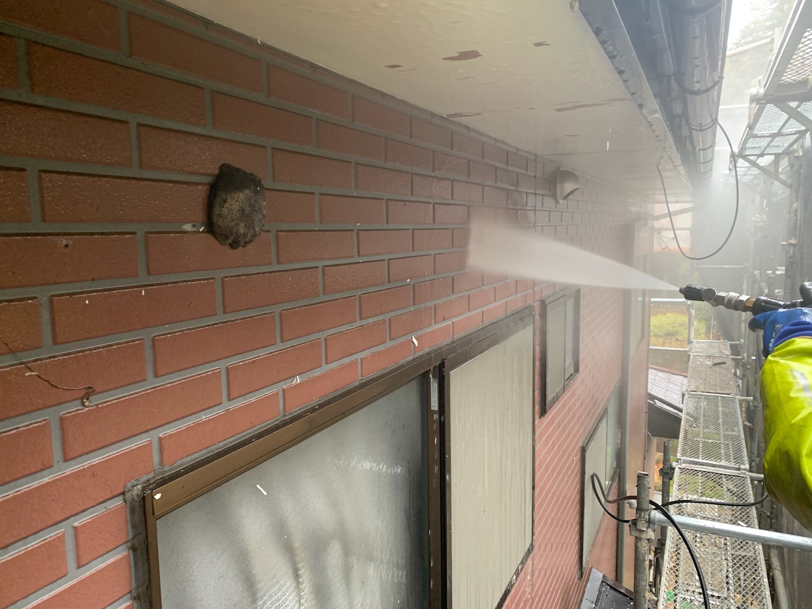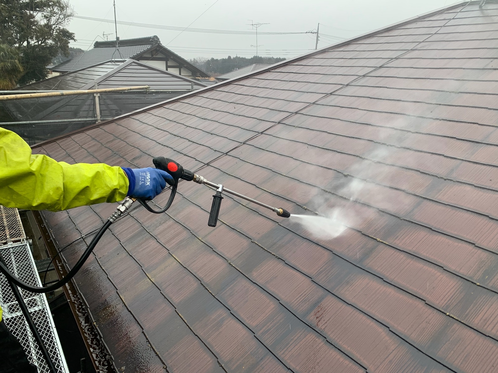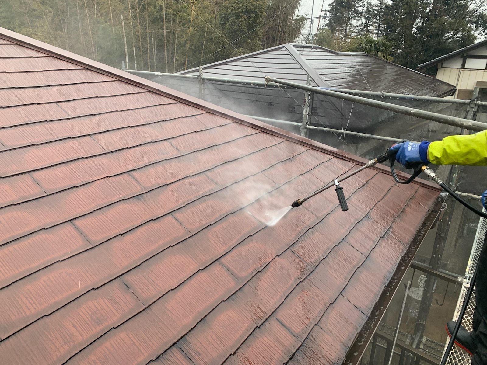 塗料と建材の密着を強くするために、外壁や屋根に付着した埃や苔・汚れなどを隅々まで洗浄します。