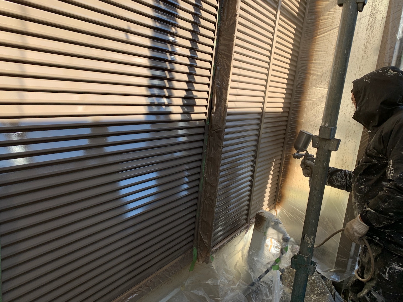 専門業者が足場を組み立てます。その際に、洗浄水や塗料の飛散を防水するシートを足場全体に掛けます。