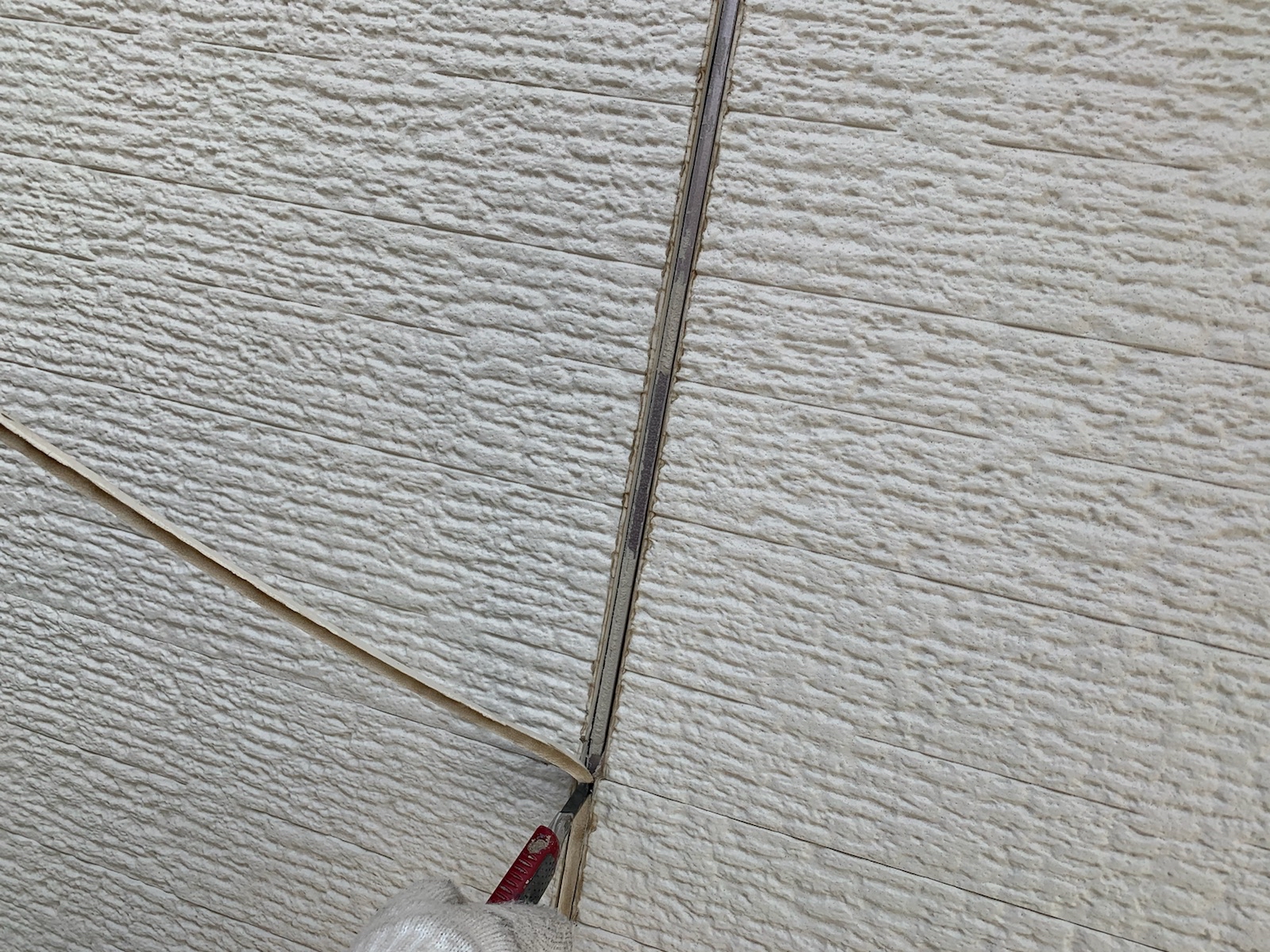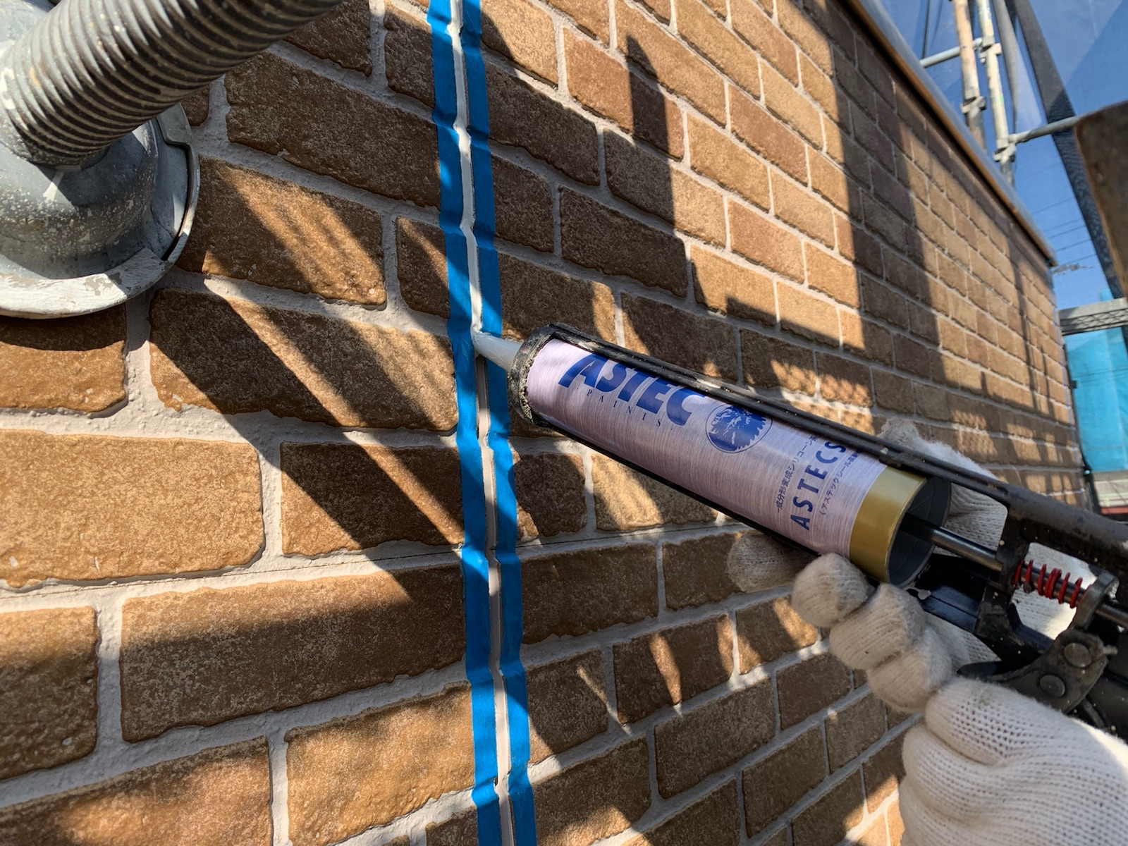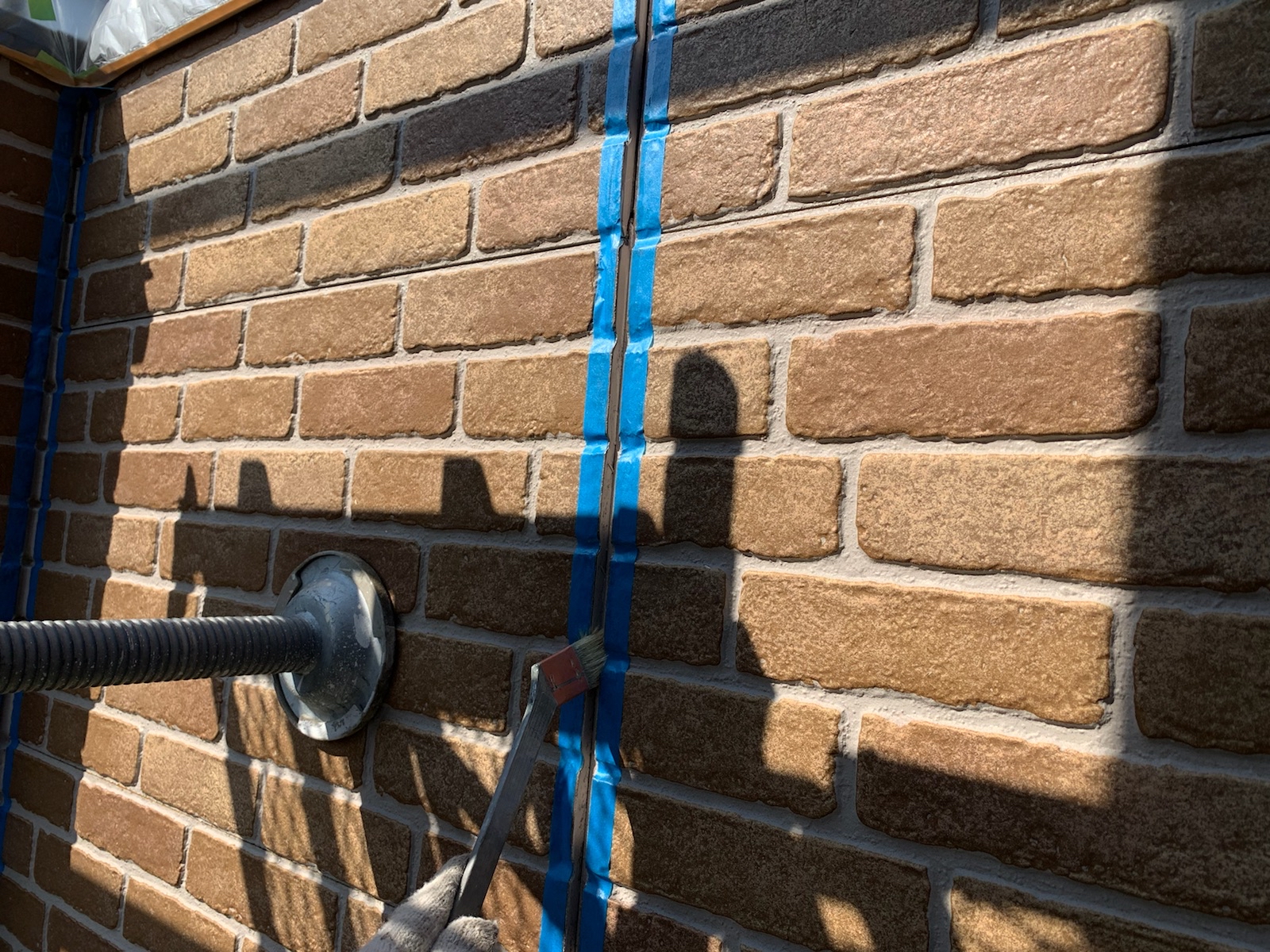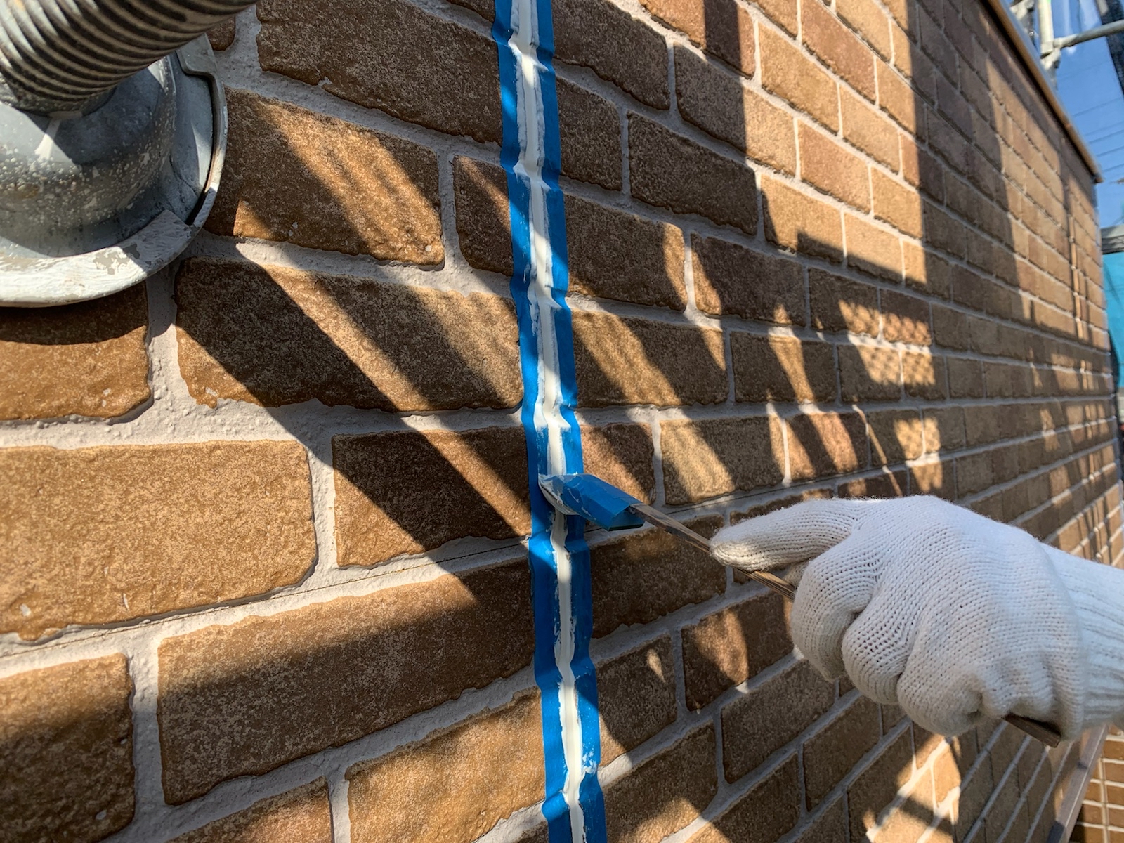 既存のコーキングを撤去します。撤去後は、目地に残った埃を刷毛を使って綺麗にとります。