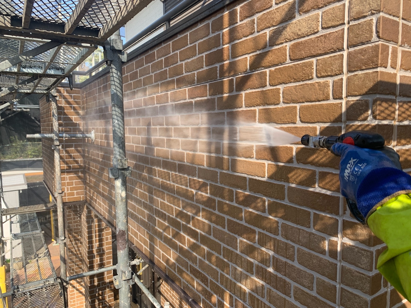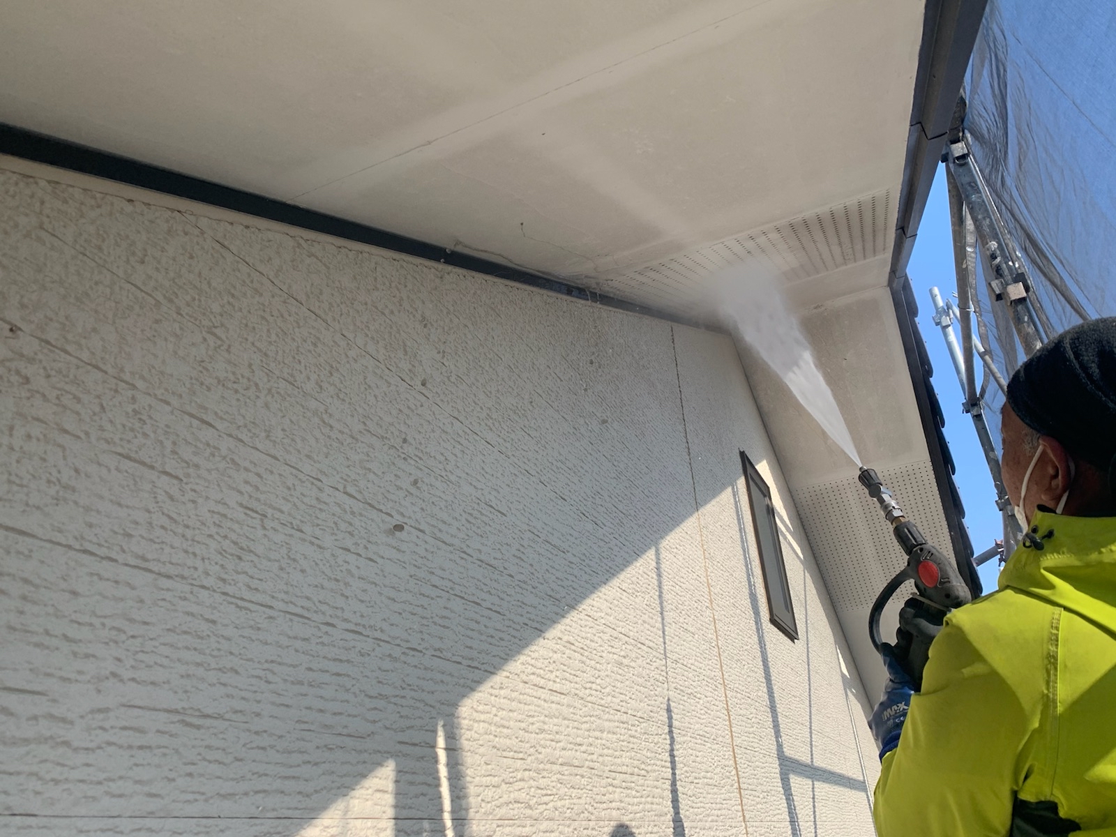 その際に、洗浄水や塗料の飛散を防止するシートを足場全体に掛けます。