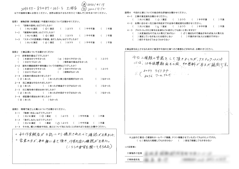 Q.工事品質を向上させるためのご意見や今回の工事へのご感想などがあれば、お聞かせください。