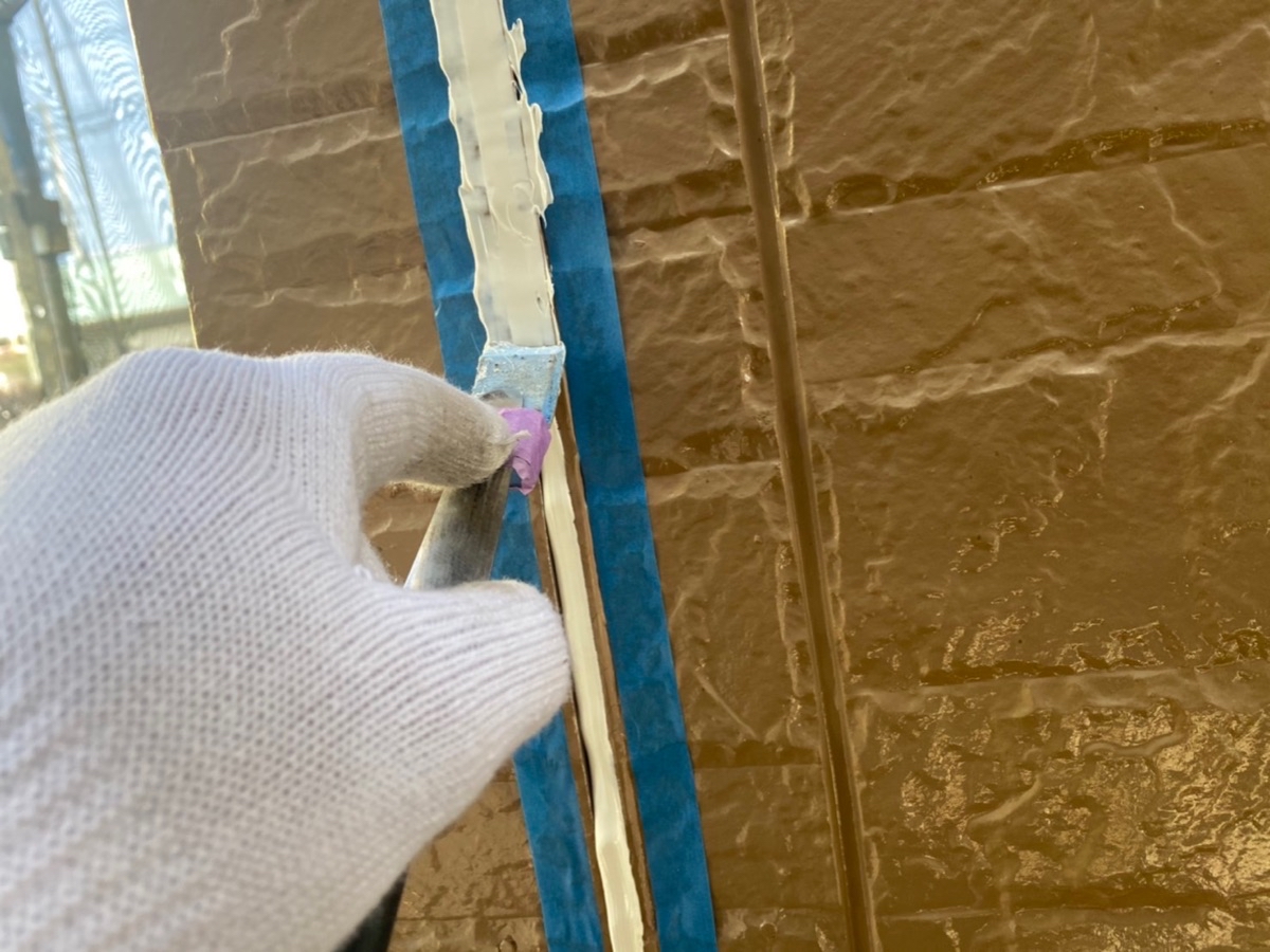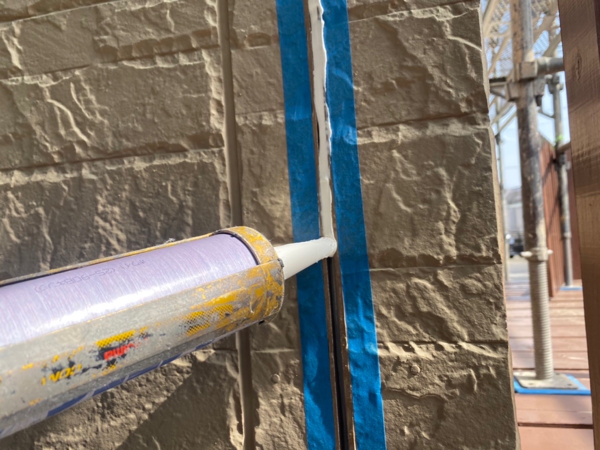 コーキング材の充填です。目地内部に空洞ができないように、たっぷりと注入します。