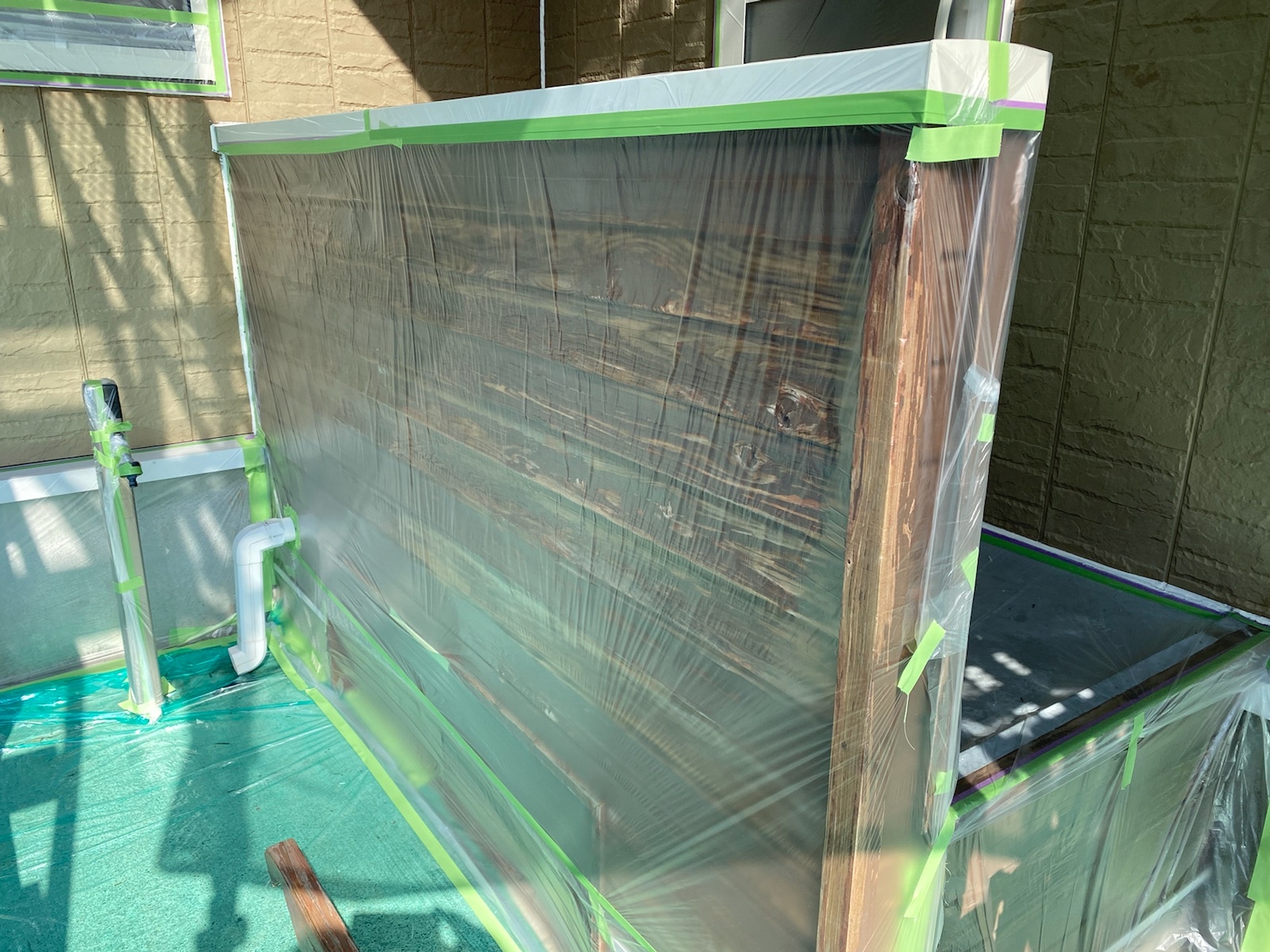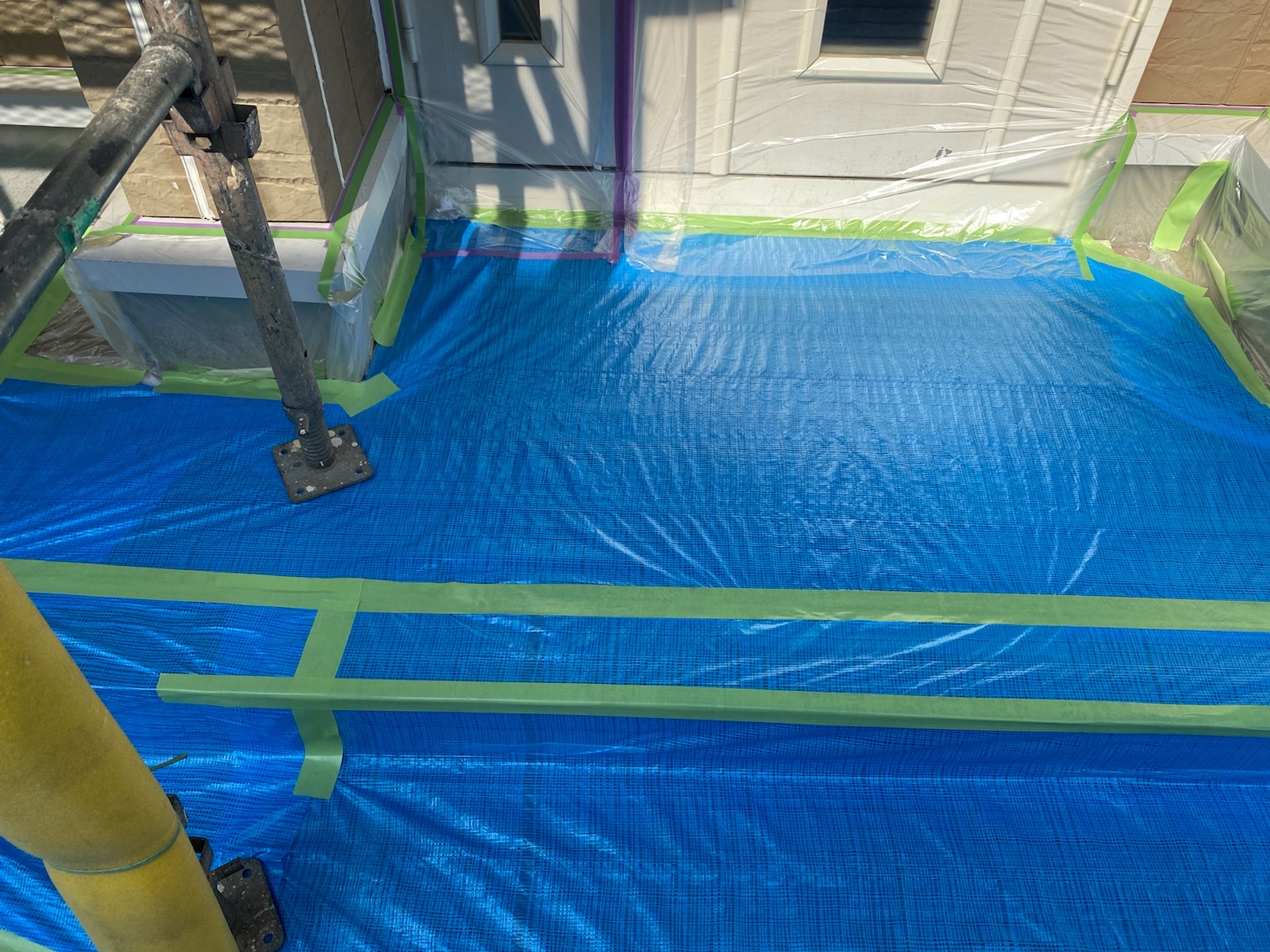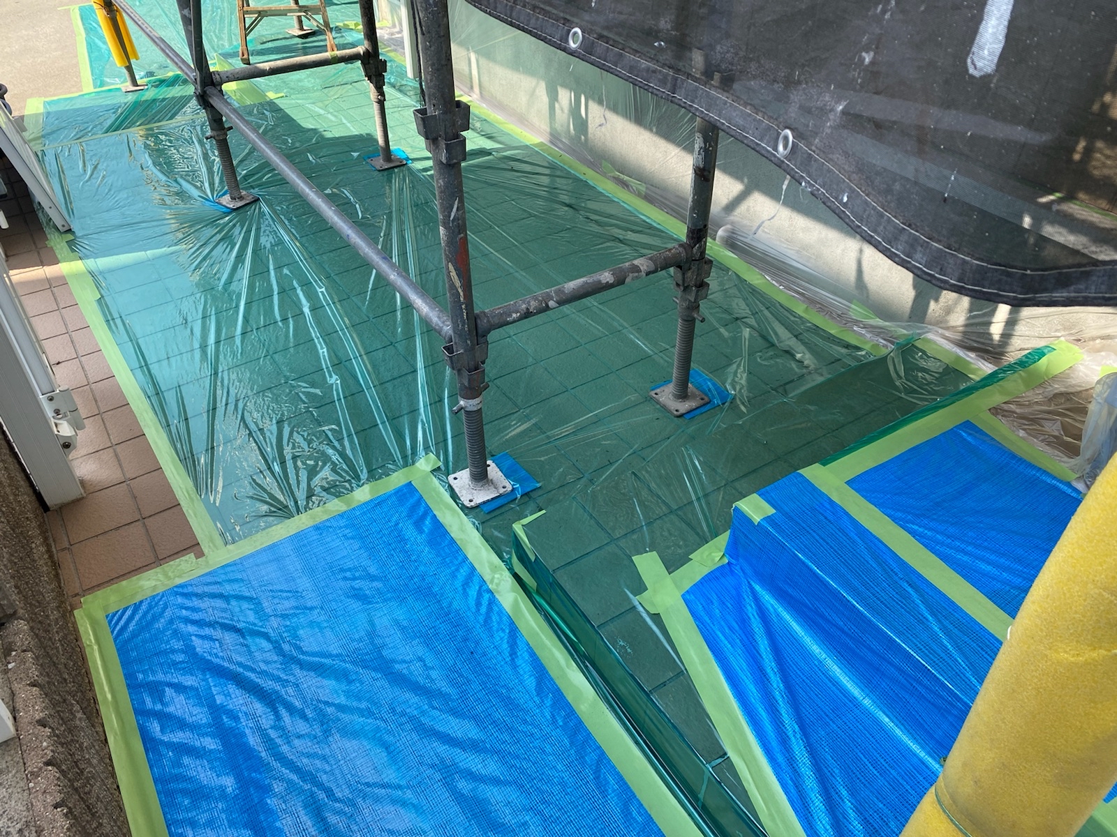 塗料や汚れなどが付着しないように塗装しない面を養生シートなどで覆う工程です。