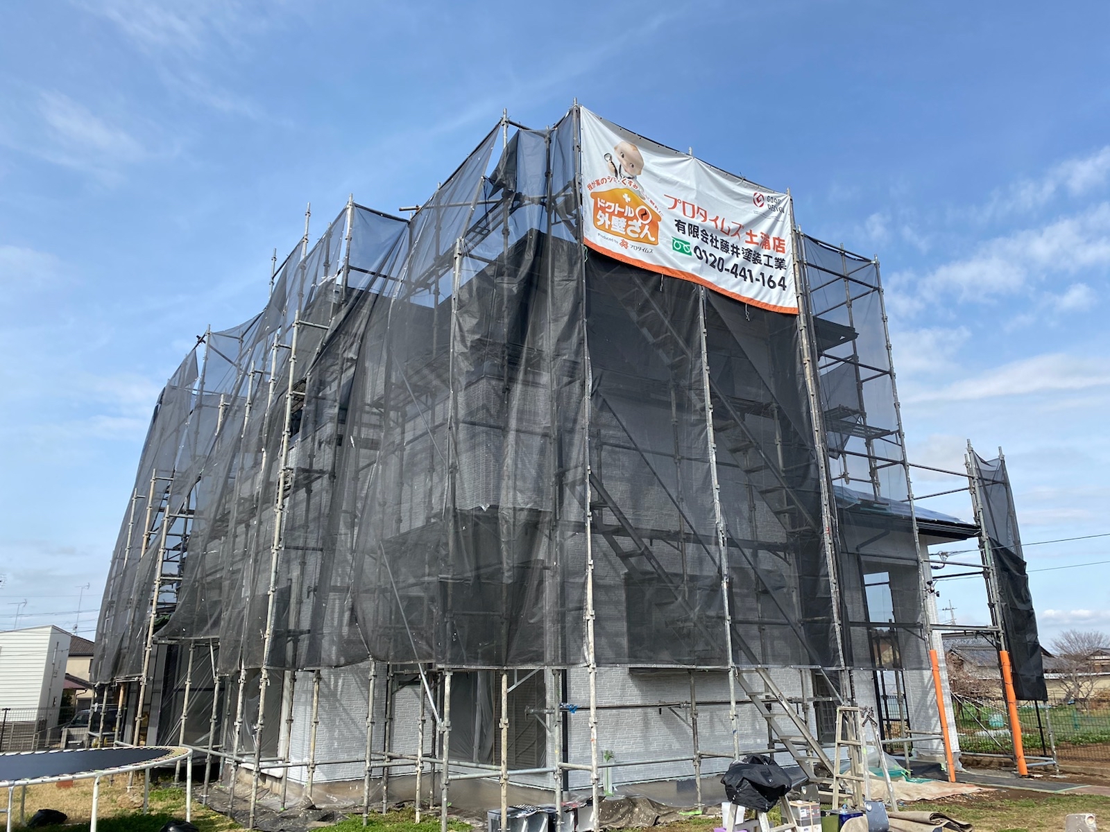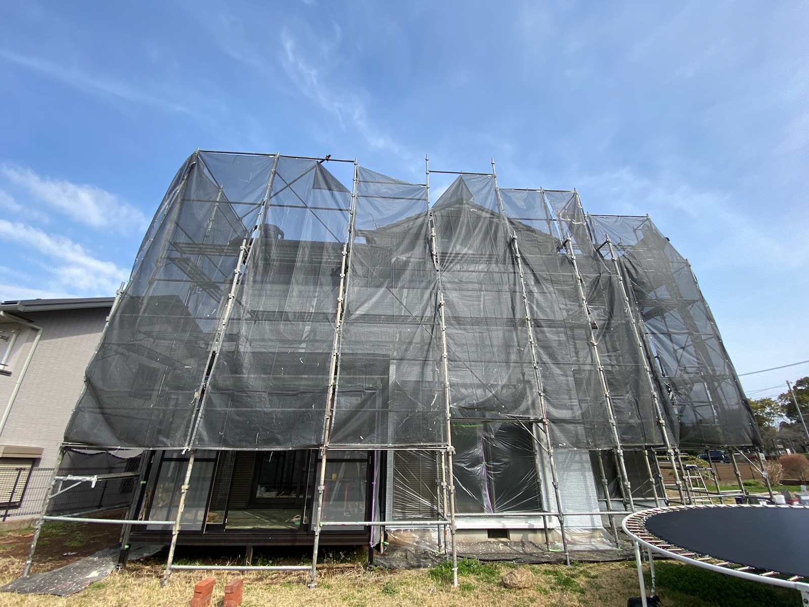 専門業者が足場を組み立てます。その際に、洗浄水や塗料の飛散を防水するシートを足場全体に掛けます。