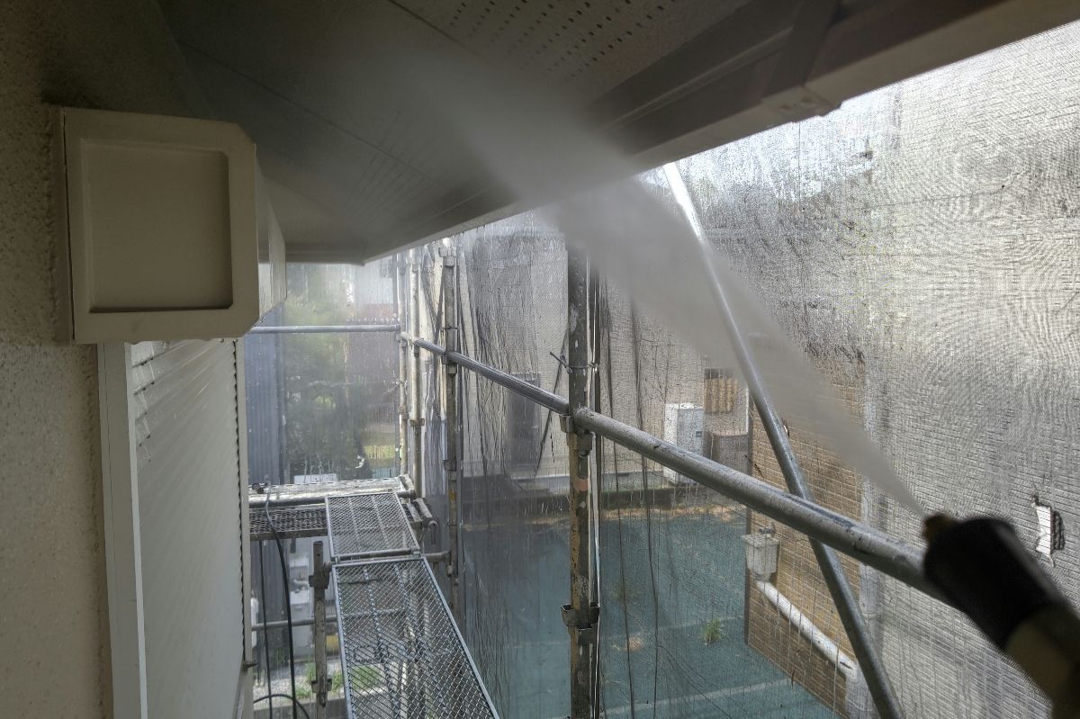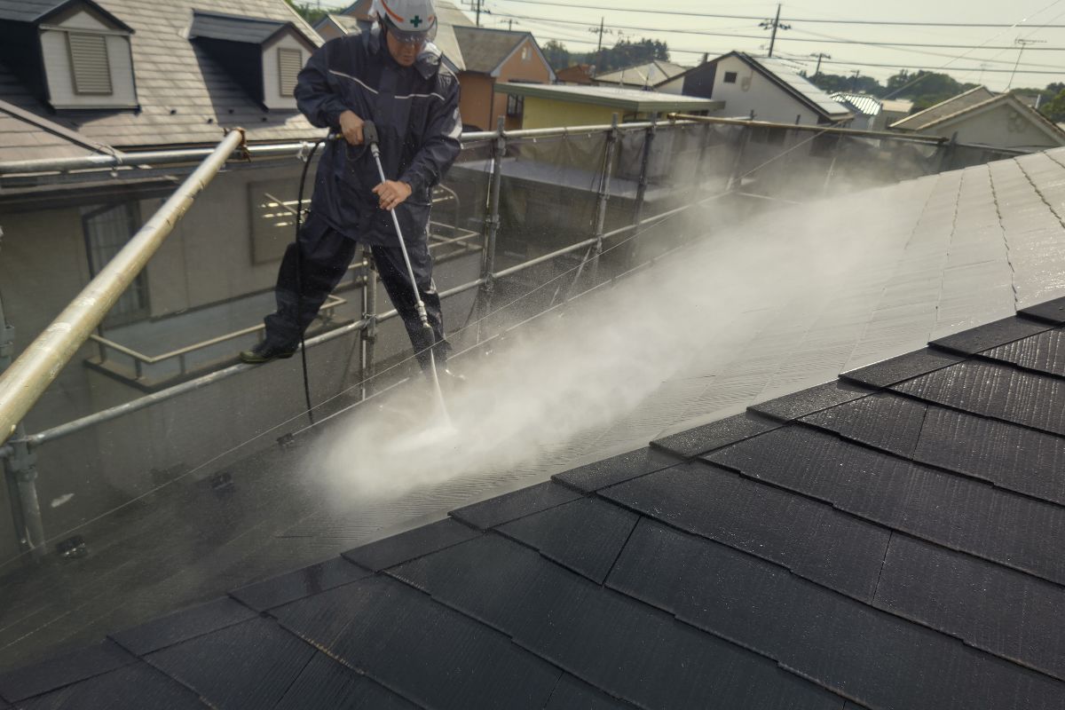 塗料と建材の密着を強くするために、外壁や屋根に付着した埃・苔・汚れなどを隅々まで洗浄します。