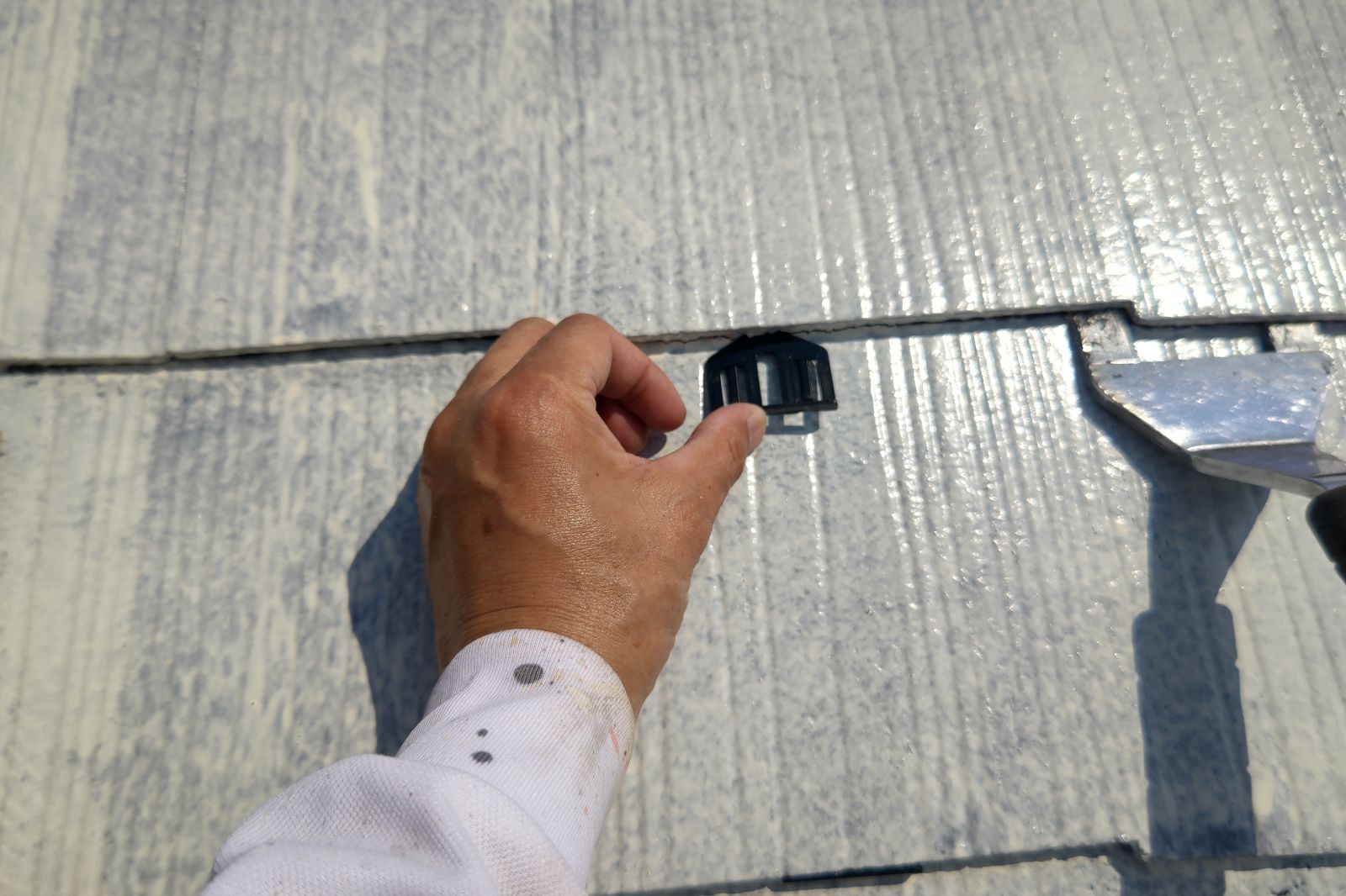 タスペーサー取付けです。屋根同士がくっつくんを防ぐ、縁切りをタスぺーサーで行います。