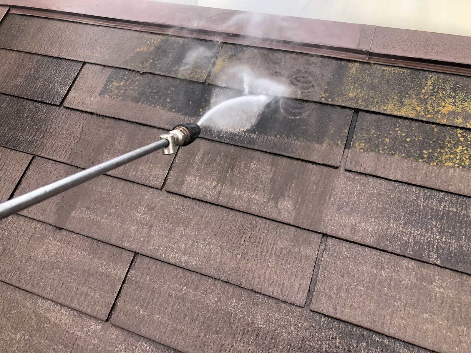 塗料と建材の密着を強くするために外壁や屋根に付着した埃・苔・汚れなどを隅々まで洗浄します。