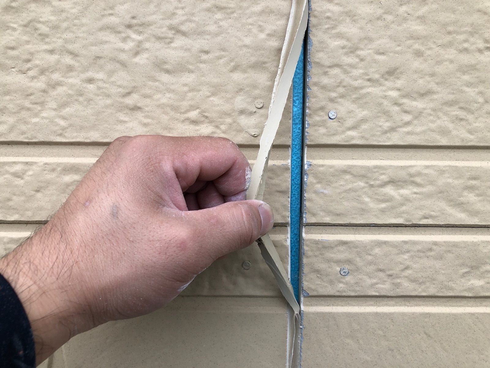 既存のコーキングの撤去。撤去後は、目地に残った埃をハケを使って綺麗にとります。