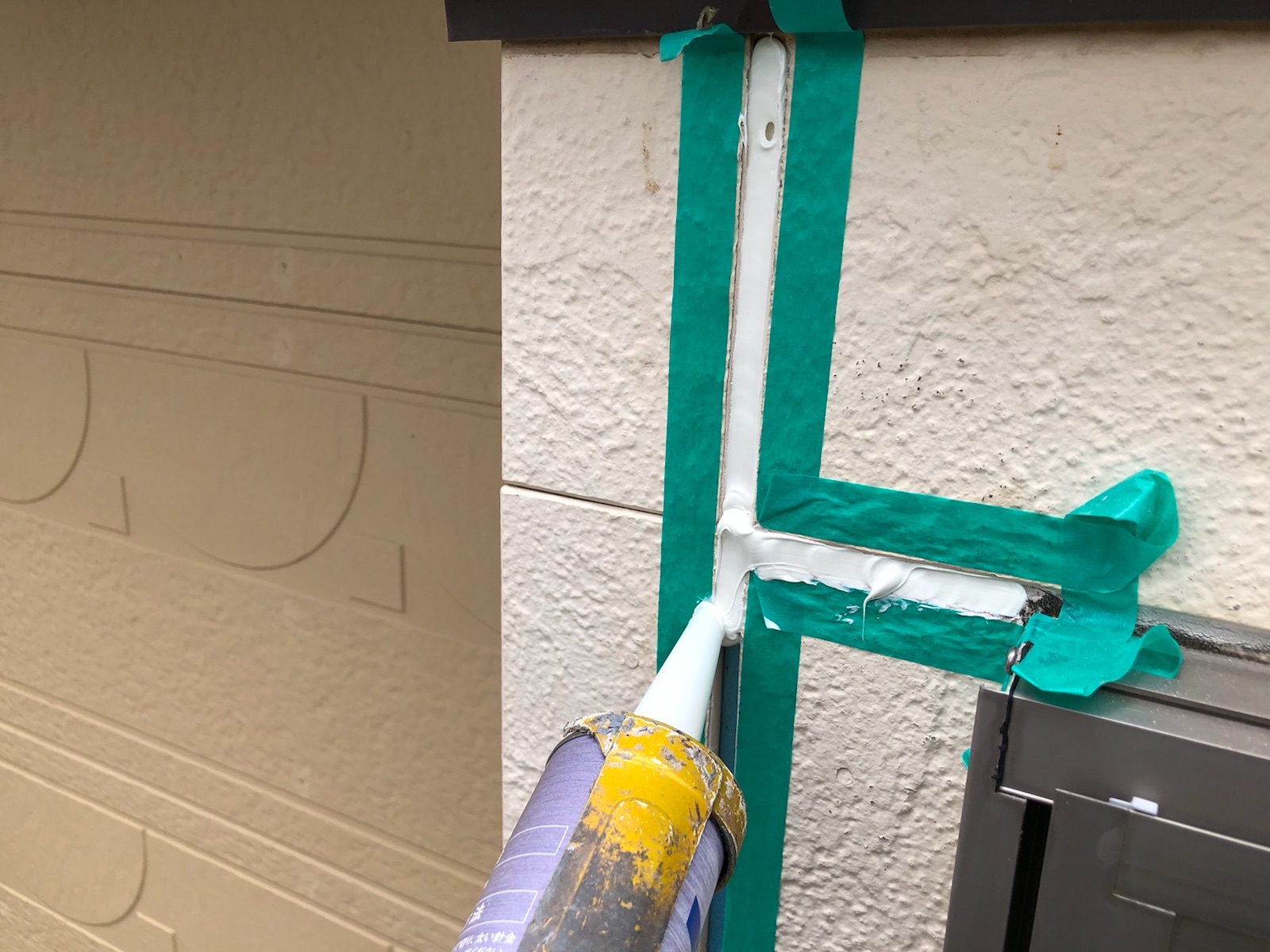 コーキング材の充填です。目地内部に空洞ができないように多めに注入していきます。