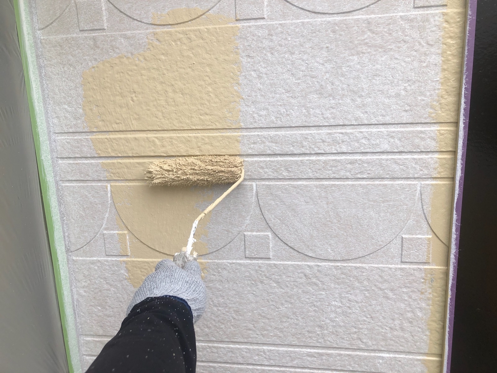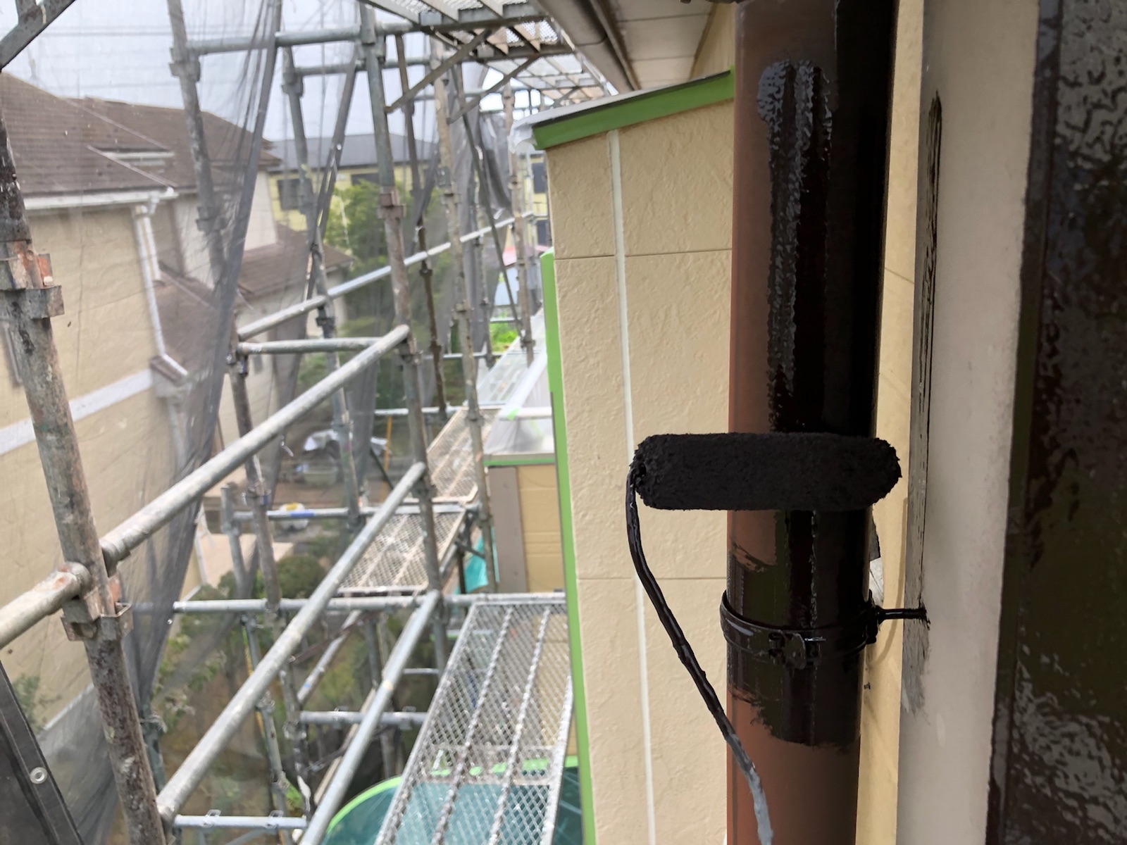 中塗りです。ご希望の色に外壁を仕上げていきます。塗料の性能を最大限に発揮させるため、基準塗布量や乾燥時間を遵守します。