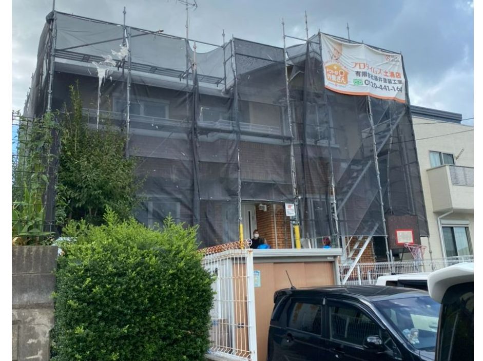 専門業者が足場を組み立てます。その際に、洗浄水や塗料の飛散を防止するシートを足場全体に掛けます。