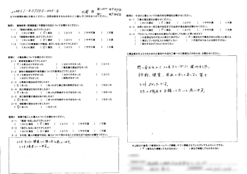 経過築年数から外壁と屋根の傷みが気になっていて、そろそろ塗替えの時期かなと何件か見積もりをしました。ドローンでの屋根の確認や外装劣化診断士による診断など説明の段階で信頼出来る方だなと感じたので今回お願いする事にしました。料金や使う塗料の説明や、気になる所はありますか?と何回も確認して頂いたり、出来る事の提案をその都度話してくださいました。仕上がりはもちろん、ご近所への配慮もとても満足しています。