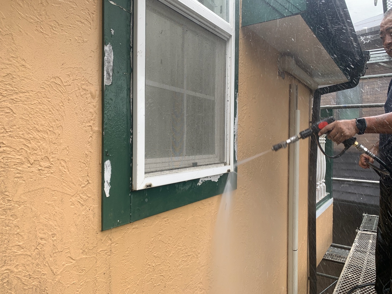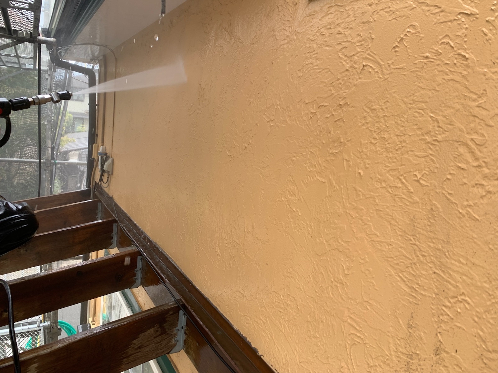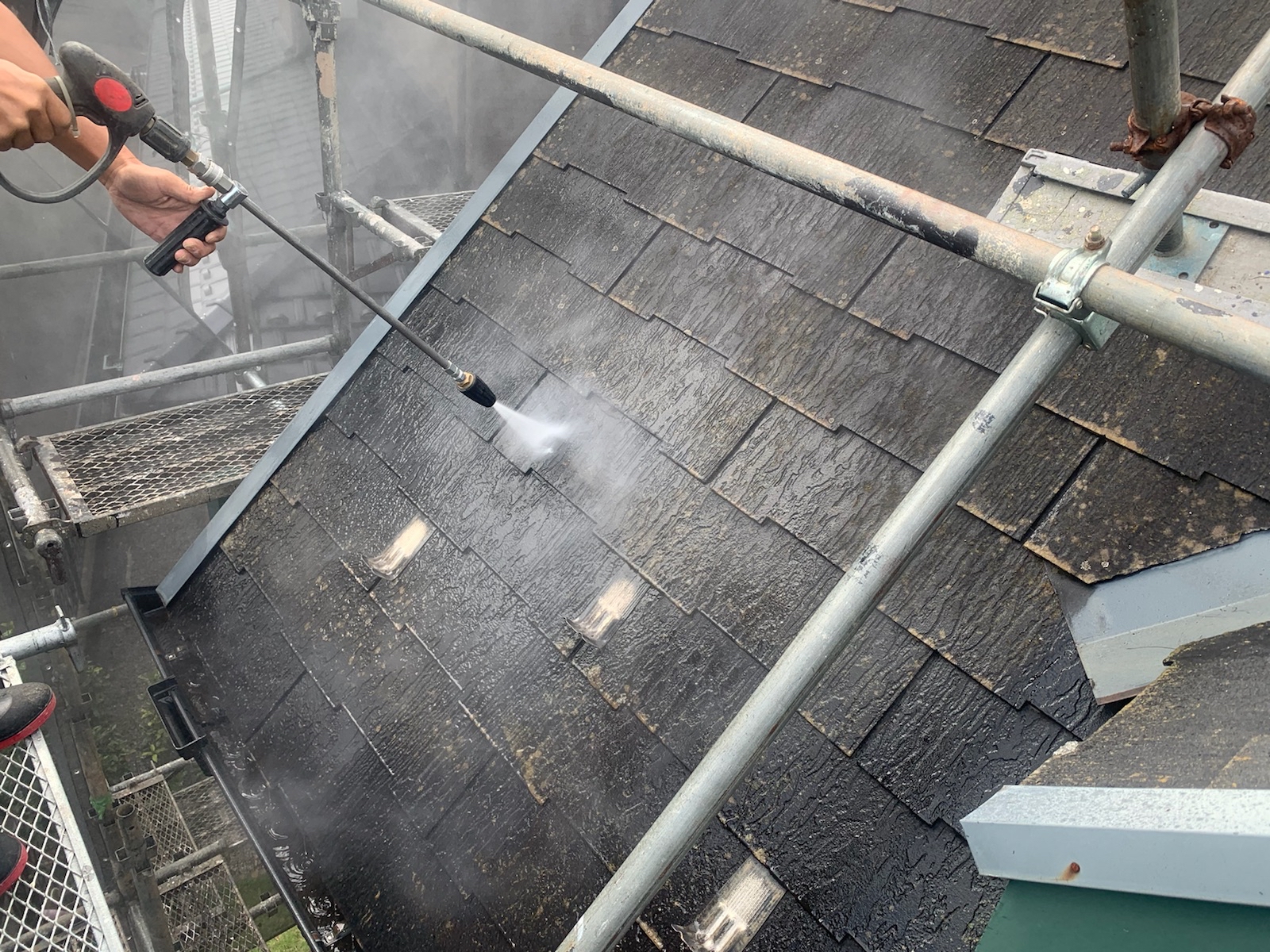 塗料と建材の密着を強くするために外壁や屋根に付着した埃・苔・汚れなどを隅々まで洗浄します。