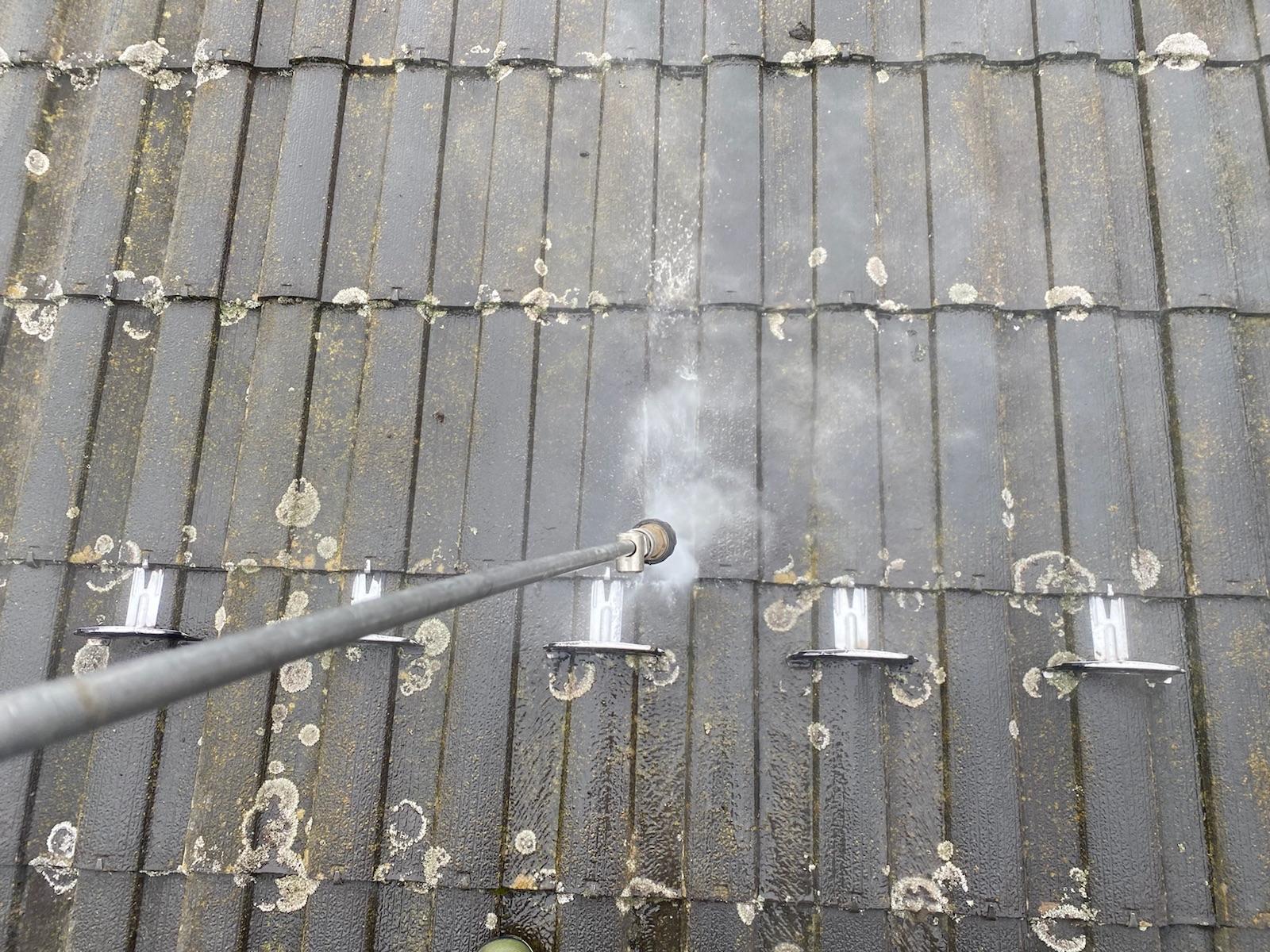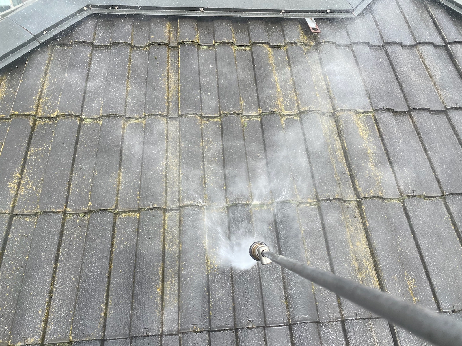塗料と建材の密着を強くするために外壁や屋根に付着した埃・苔・汚れなどを隅々まで洗浄します。