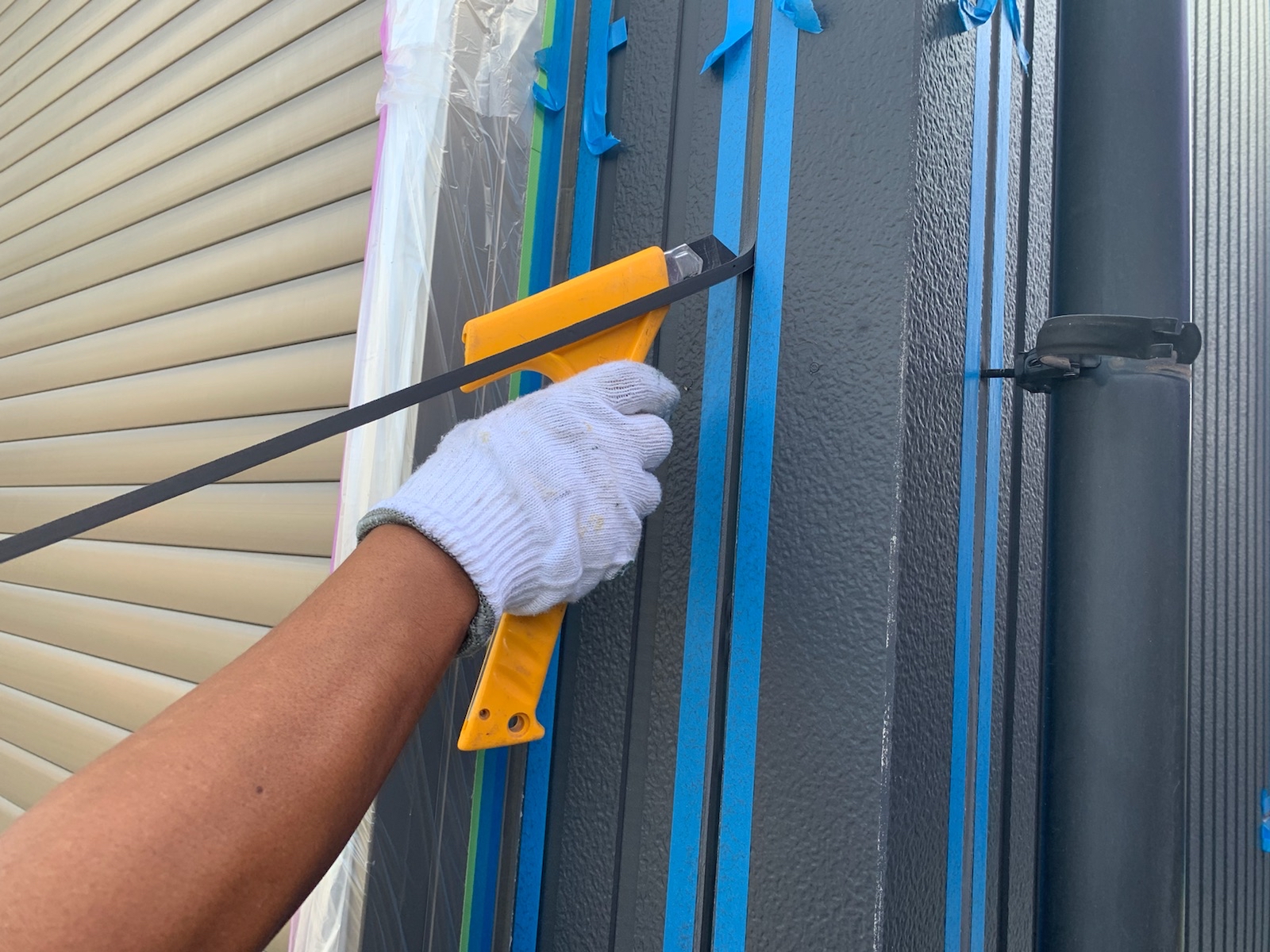既存のコーキングの撤去。撤去後は、目地に残った埃をハケを使って綺麗にとります。
