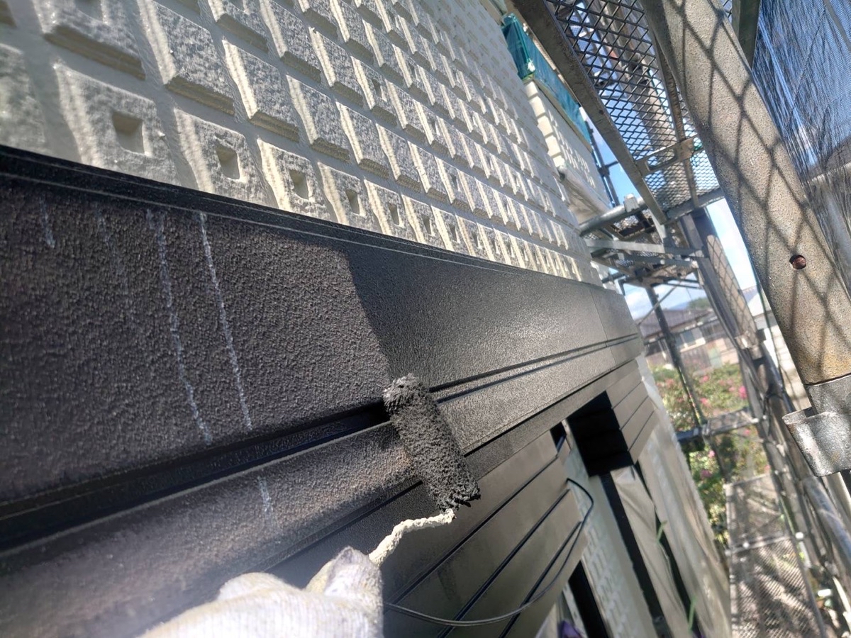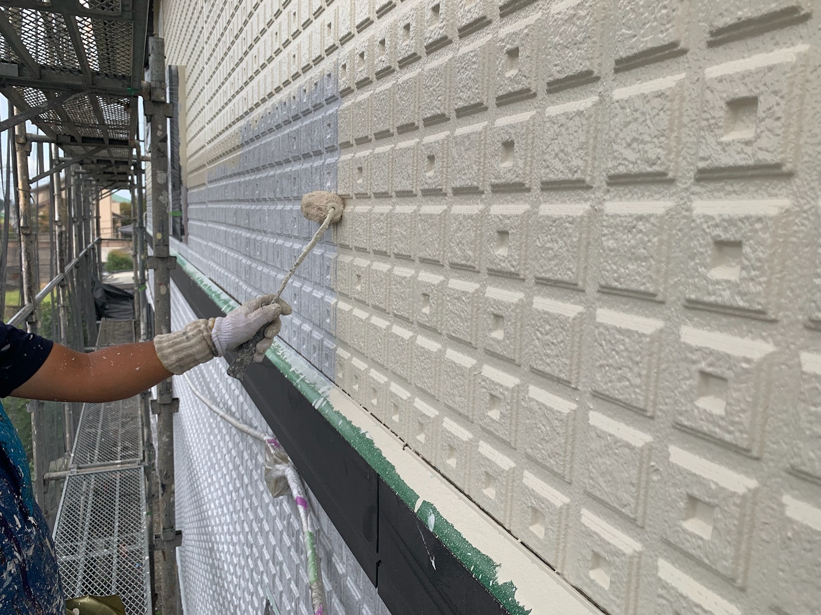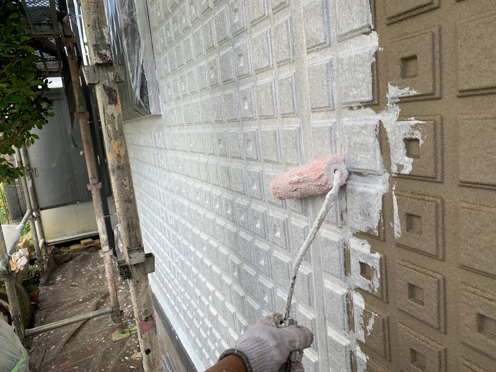 下塗りです。 下塗り塗料は、仕上げとなる上塗り塗料と外壁 を密着させる接着剤のような役割を果たします 。