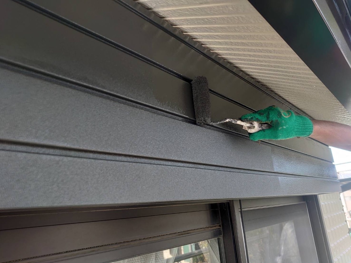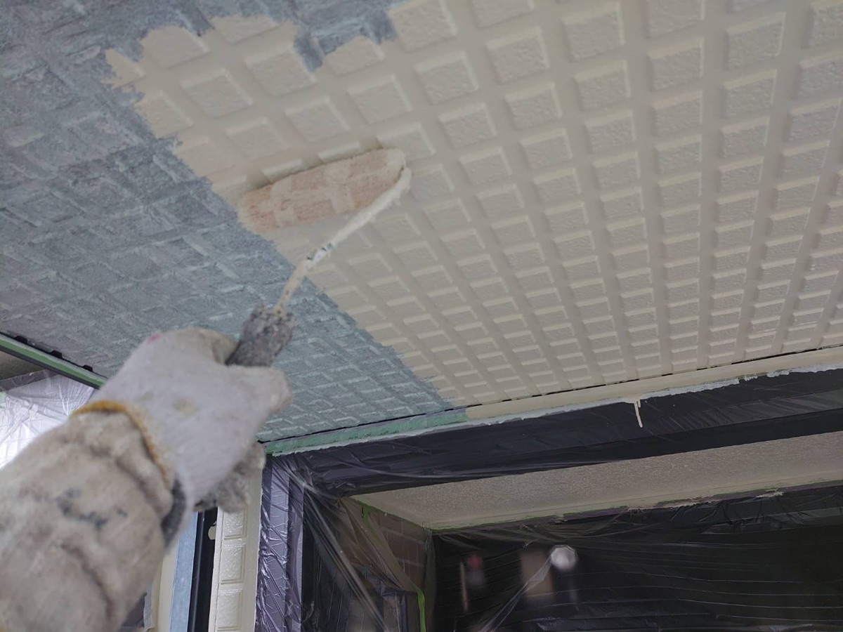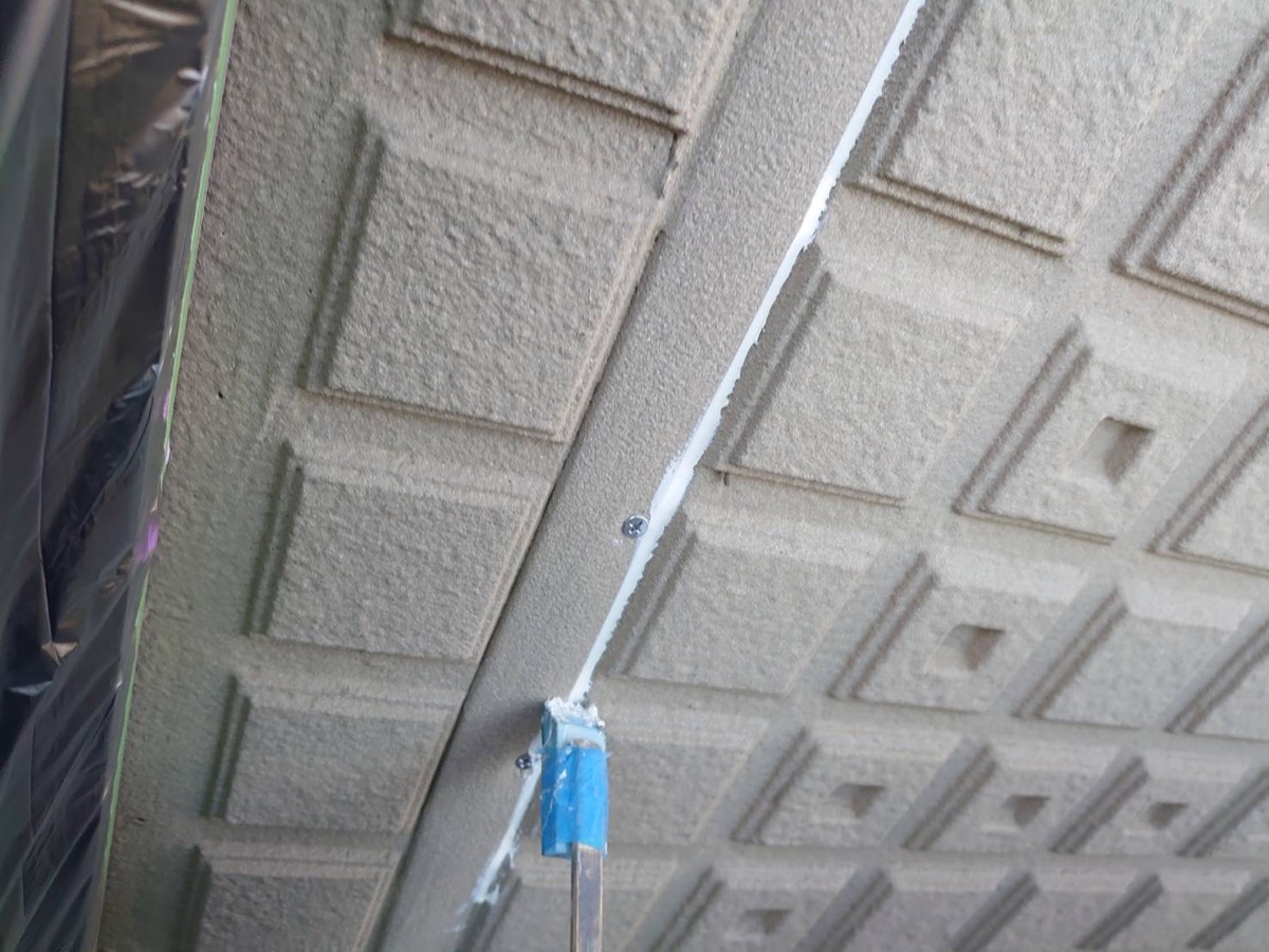 下塗りです。 下塗り塗料は、仕上げとなる上塗り塗料と外壁 を密着させる接着剤のような役割を果たします 。
