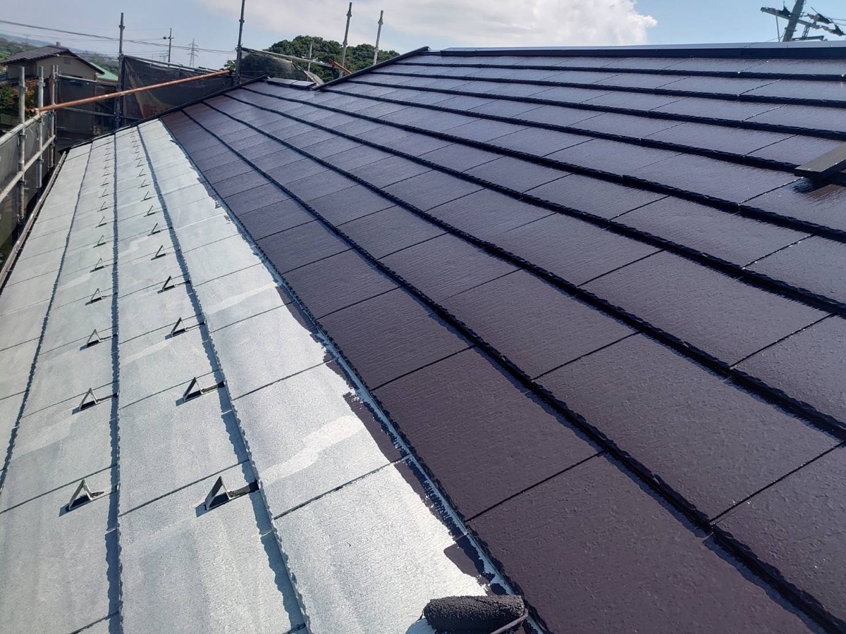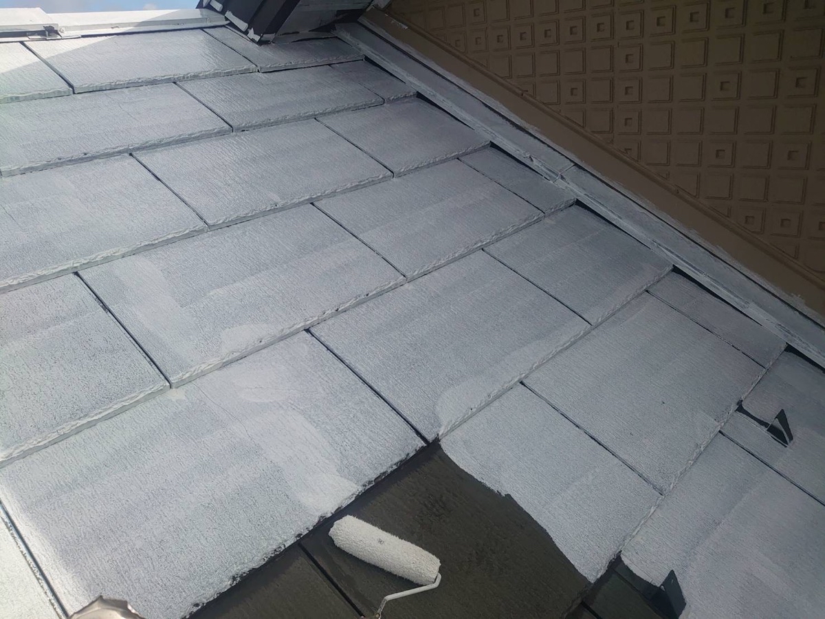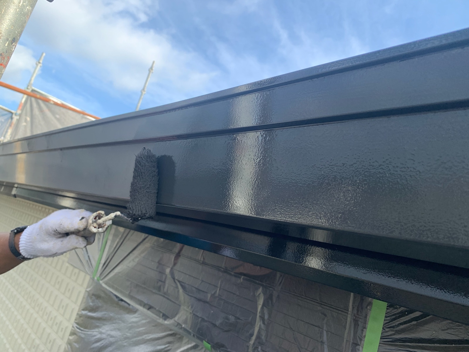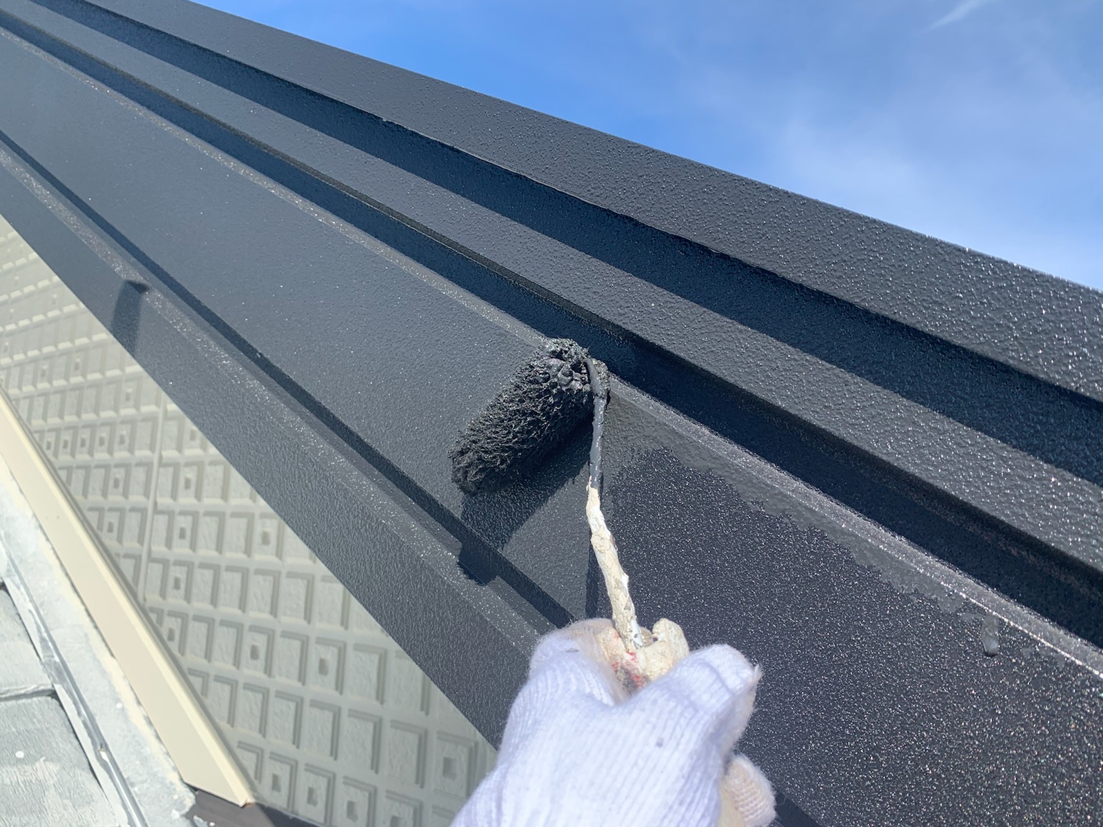 上塗りです。4Fフッ素の優れた耐候性を有し、屋根の色彩 ・光沢を長期間保つ遮熱塗料「スーパーシャ ネツサーモF」で施工しました。