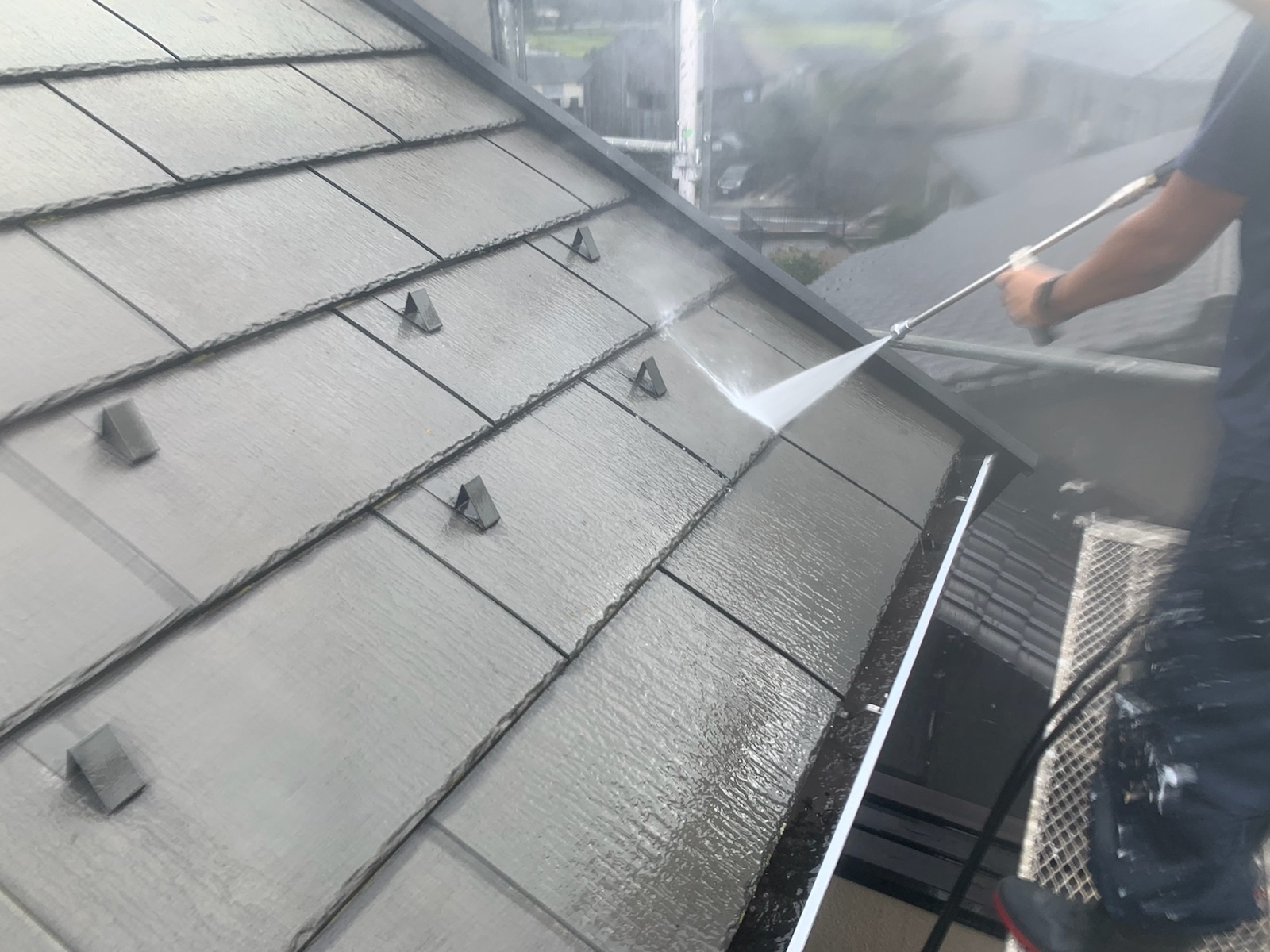 塗料と建材の密着を強くするために、外壁や屋 根に付着したホコリ・コケ・汚れなどを隅々ま で洗浄します。