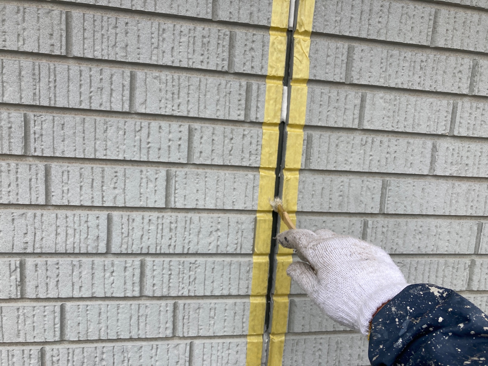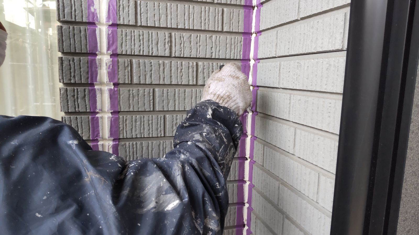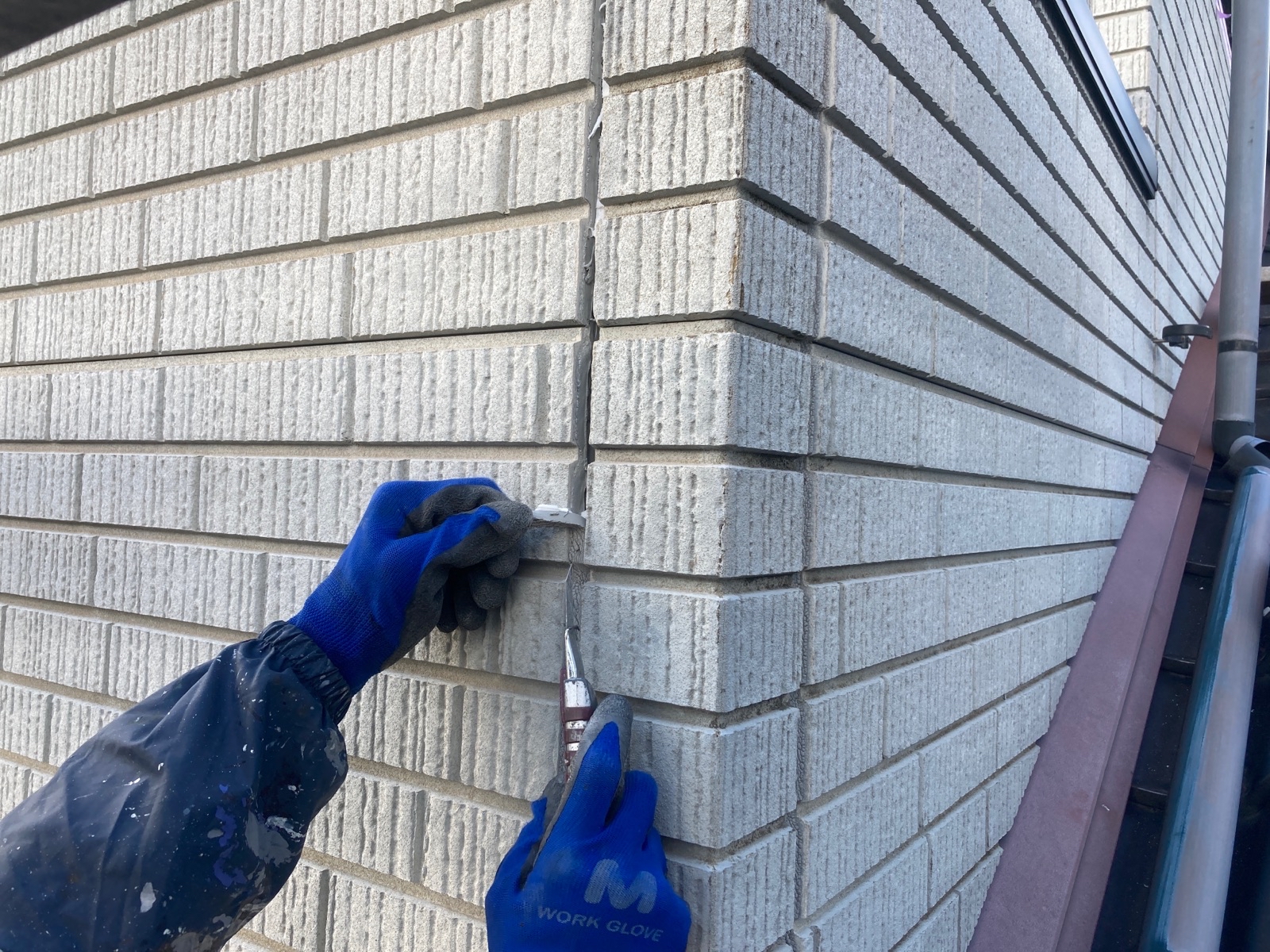 既存のコーキングの撤去。撤去後は、目地に残 った埃をハケを使って綺麗にとります。