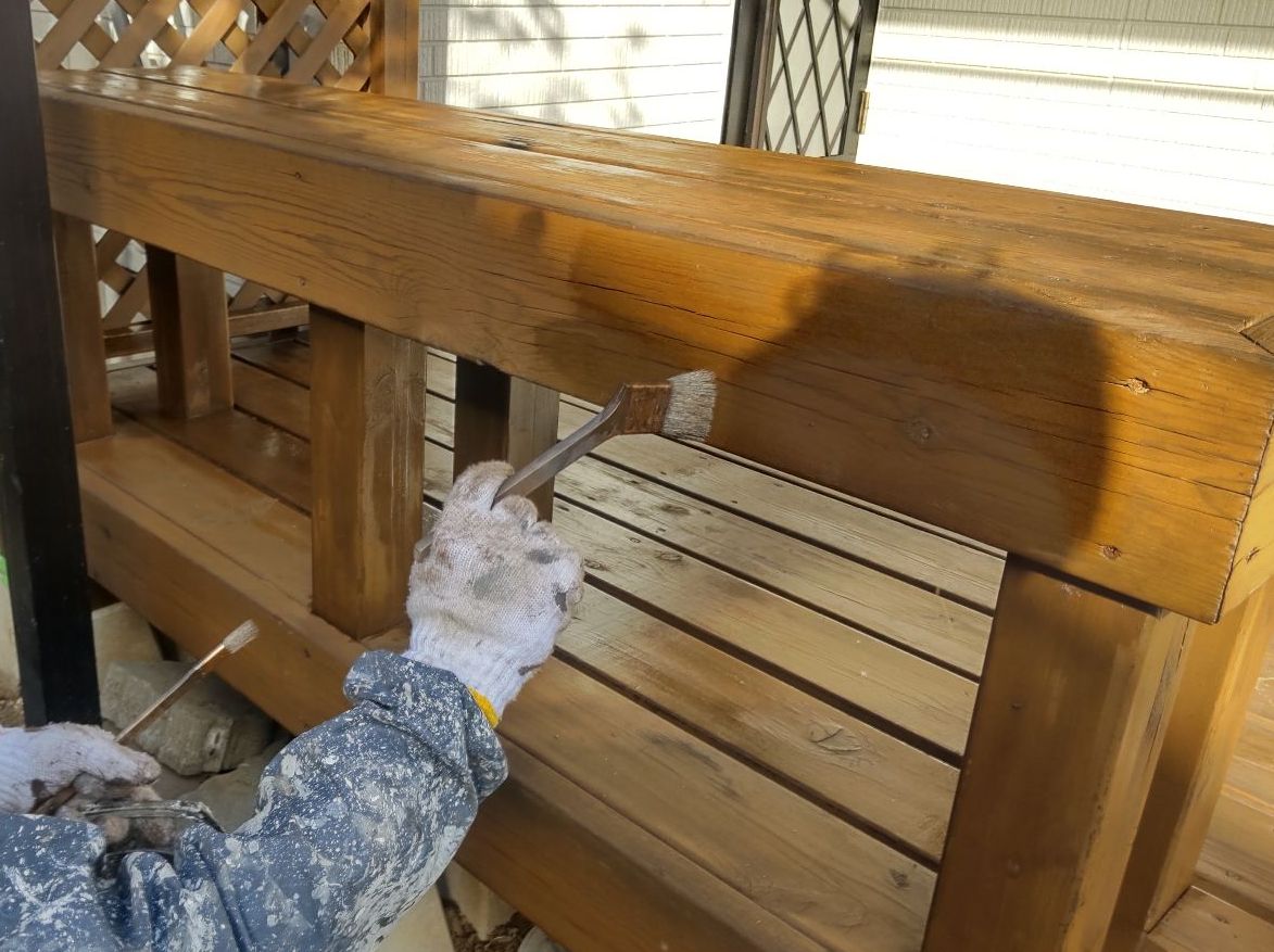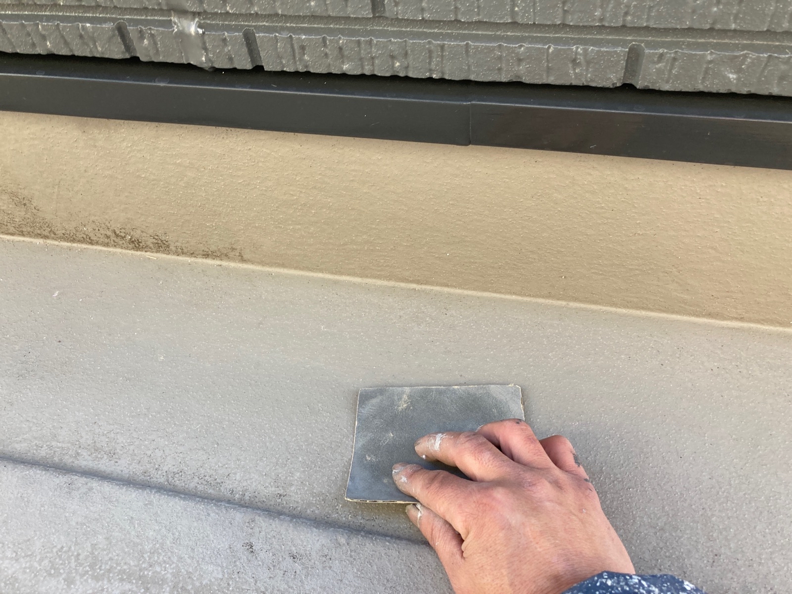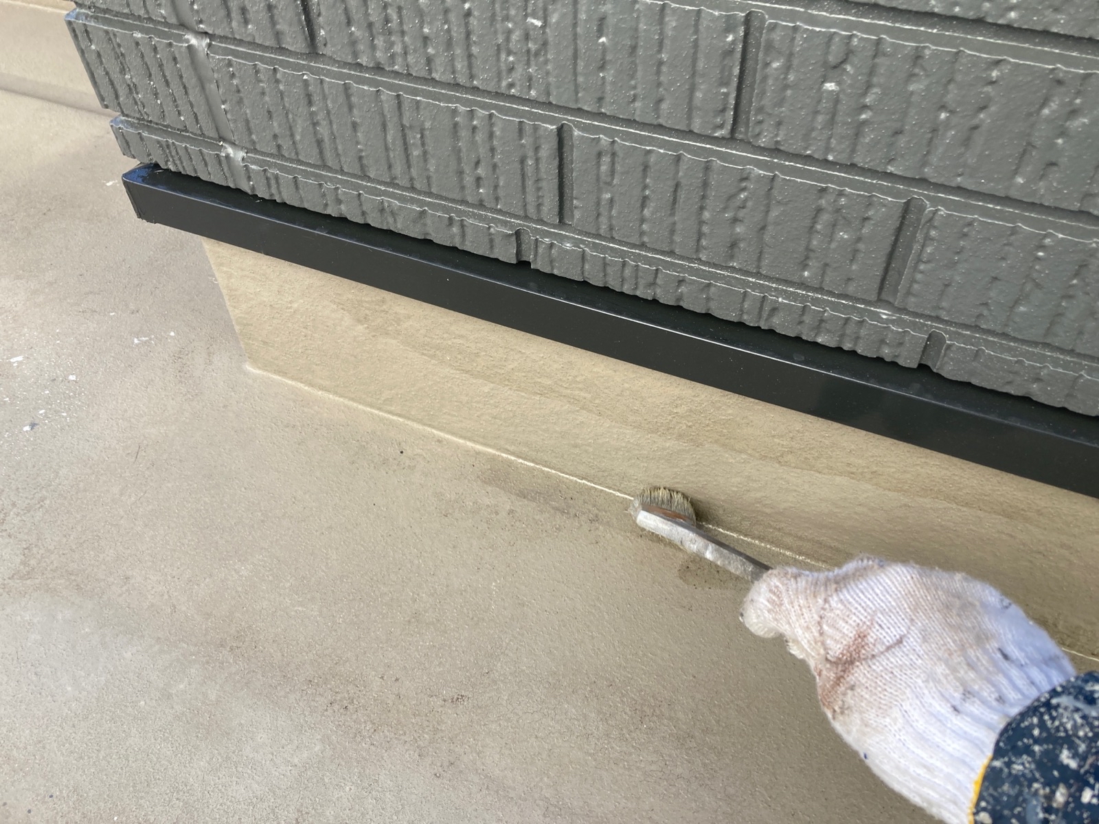 既存のコーキングの撤去。撤去後は、目地に残 った埃をハケを使って綺麗にとります。