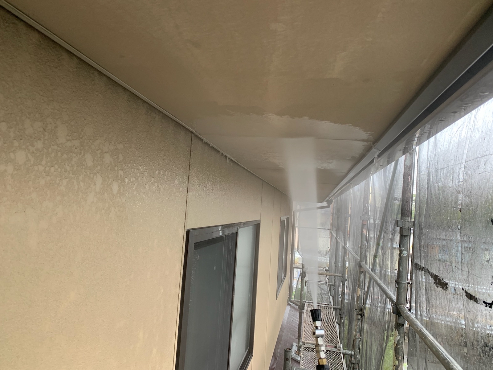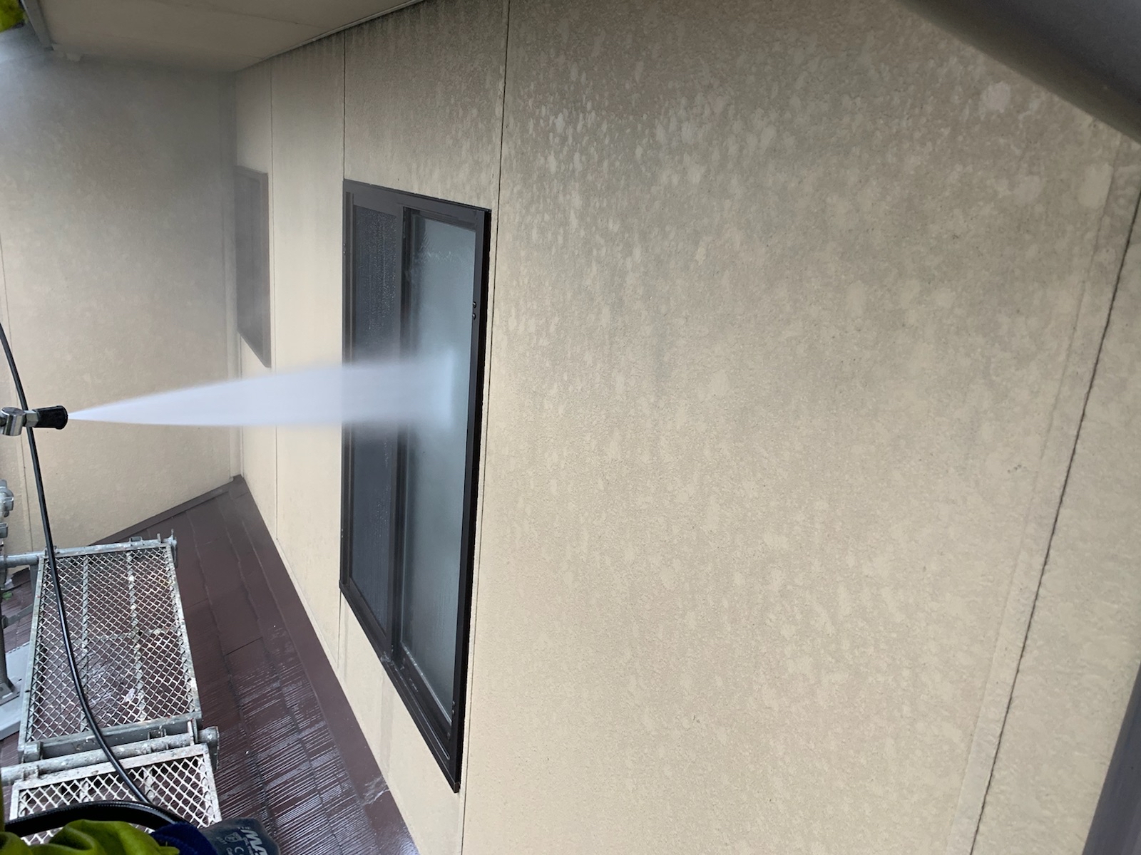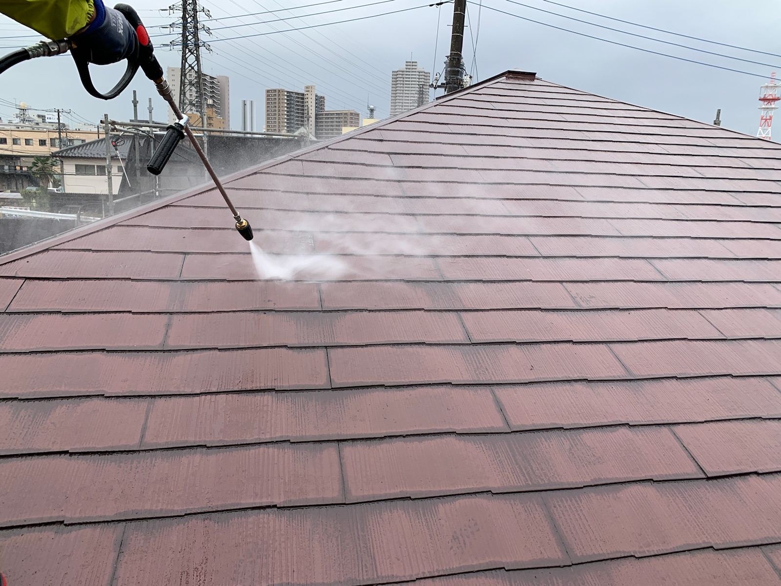 塗料と建材の密着を強くするために、外壁や 屋根に付着したホコリ・コケ・汚れなどを隅 々まで洗浄します。
