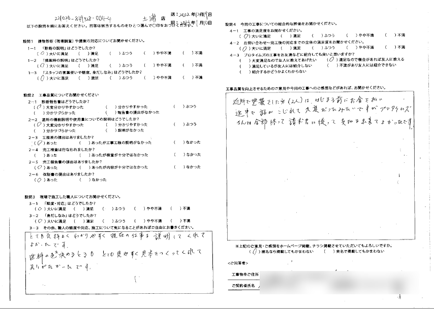 Q.工事品質を向上させるためのご意見や今回の工事へのご感想などがあればお聞かせ下さい。