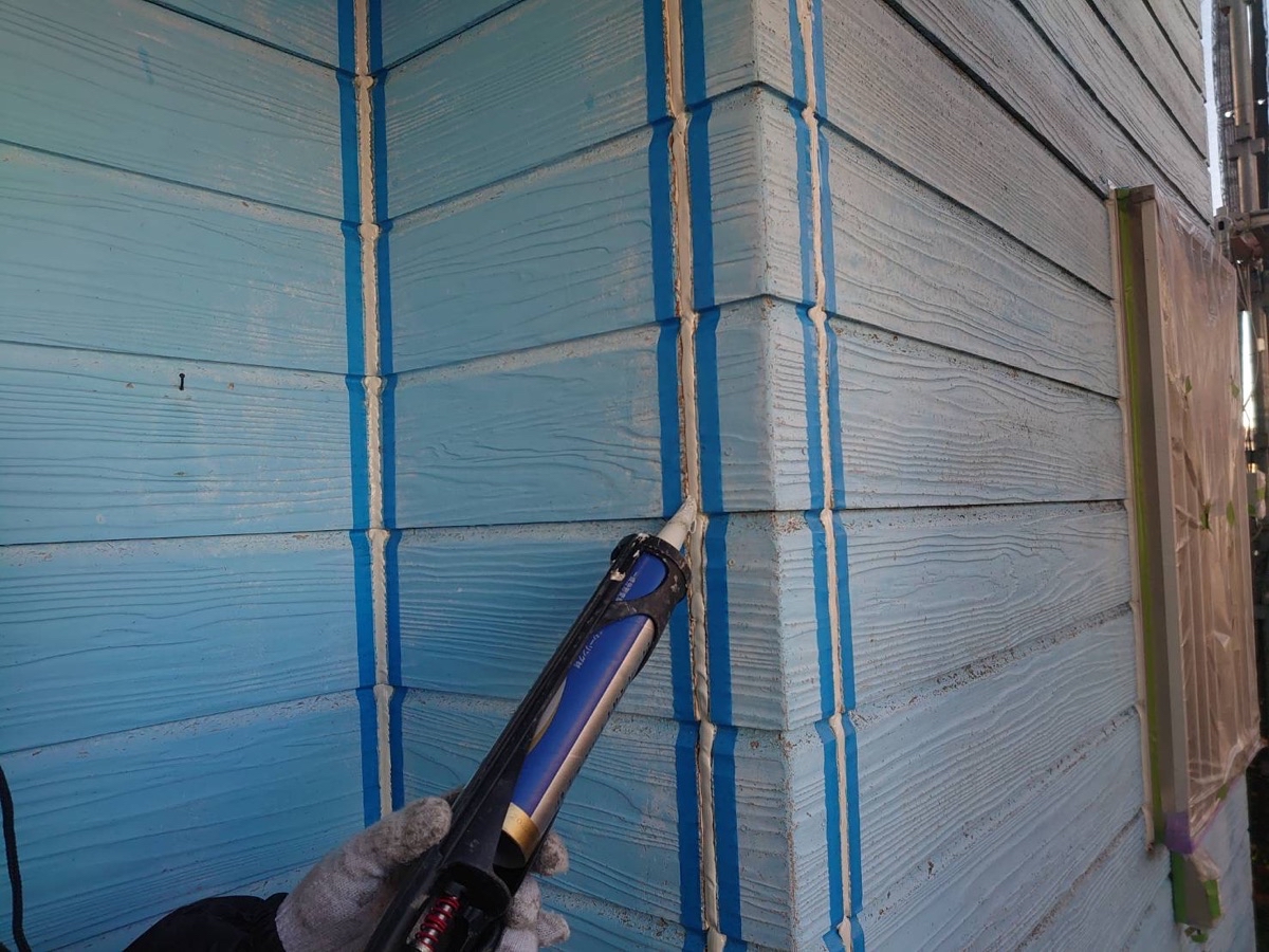 コーキング材の充填。目地内部に空洞ができないように多めに注入していきます。