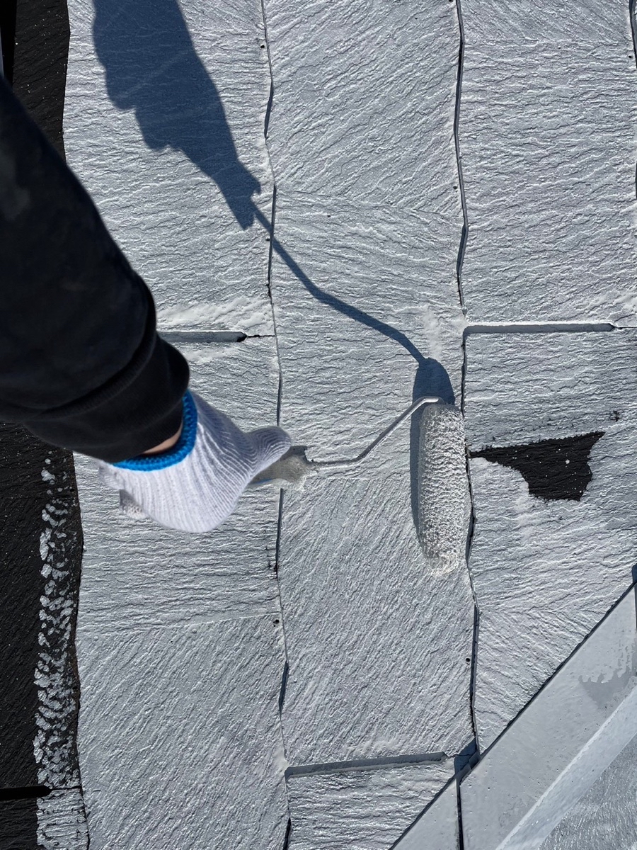 上塗り。超低汚染性・超耐候性・遮熱性・遮熱保持性を兼ね備えた無機フッ素塗料「超低汚染プラチナリファイン2000MF-IR」で施工しました。
