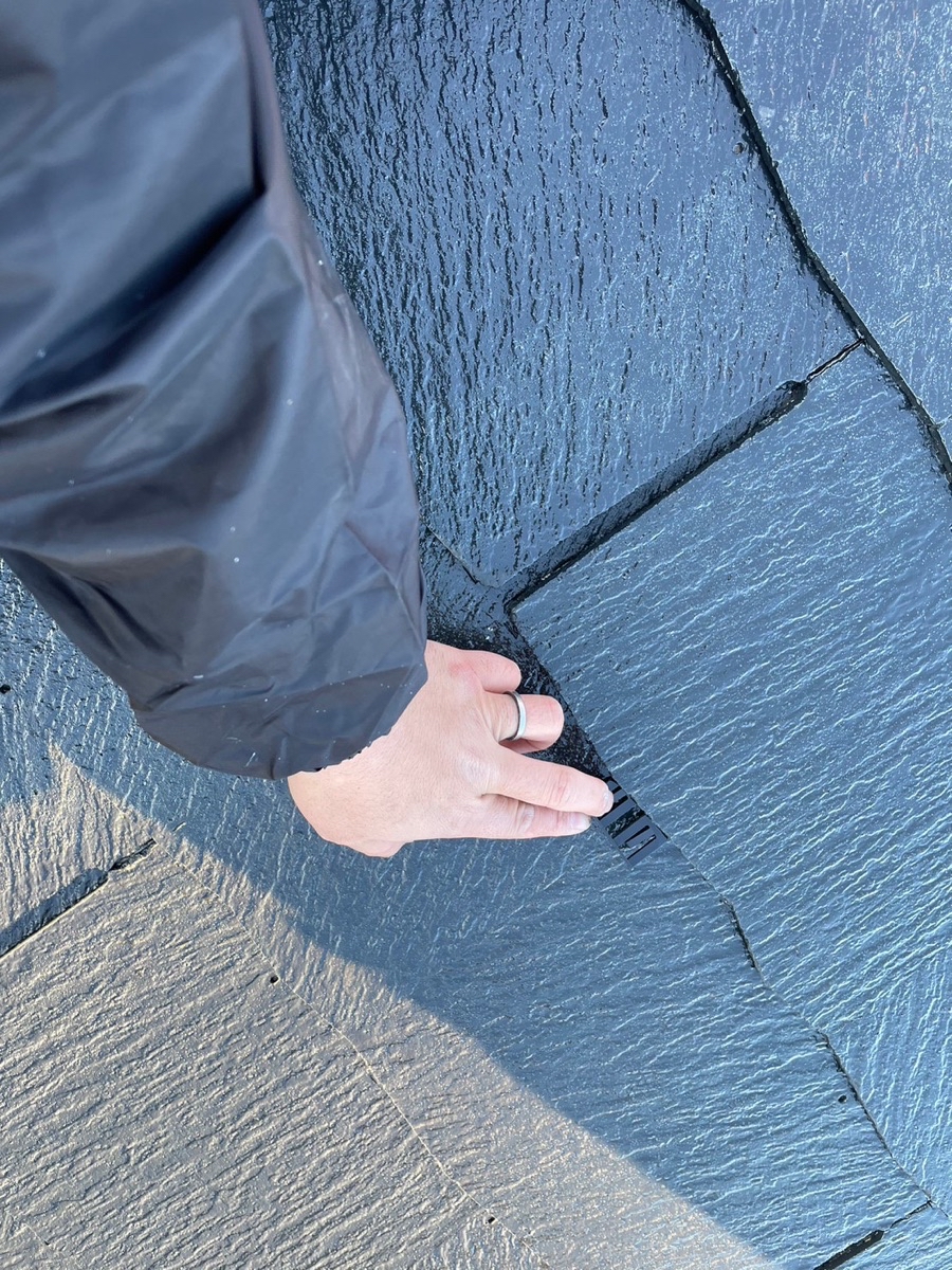 タスペーサー取付け。屋根材同士がくっつくのを防ぐ縁切りをタスペーサーで行います。