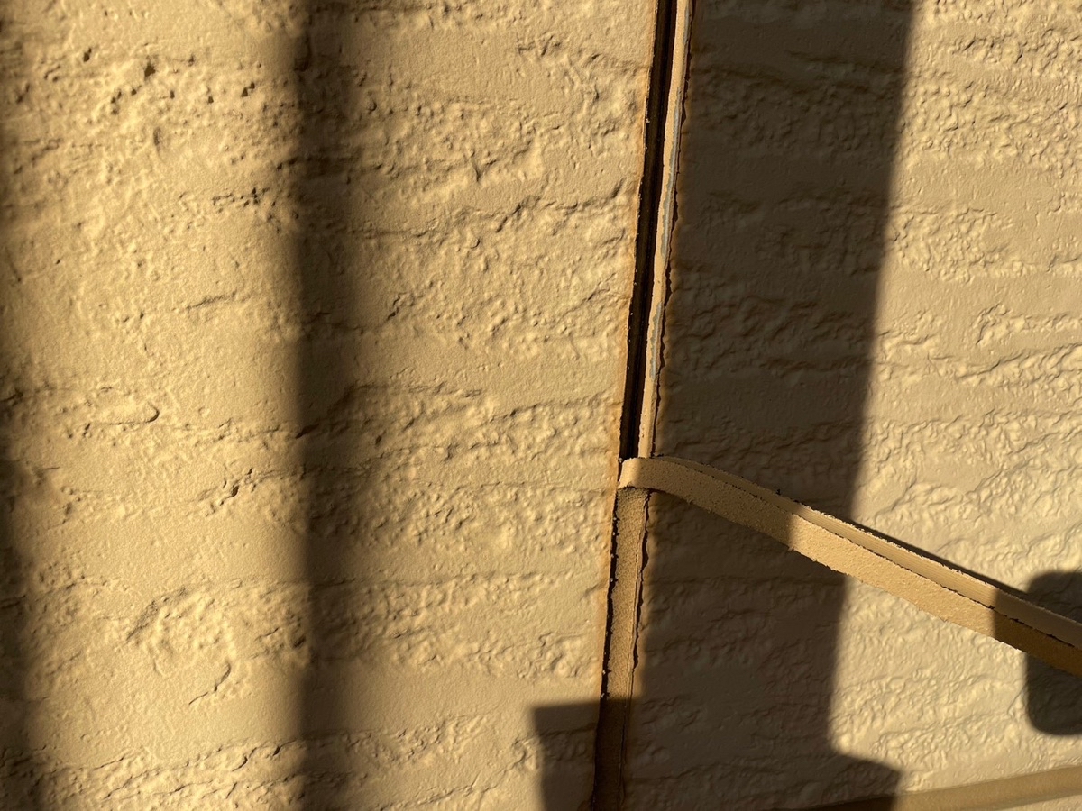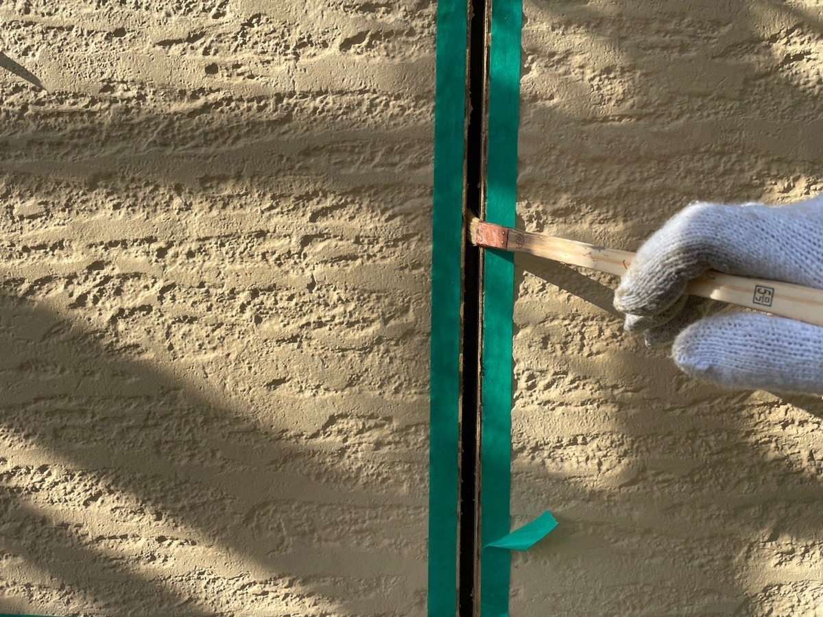既存のコーキングの撤去。撤去後は、目地に残った埃をハケを使って綺麗にとります。
