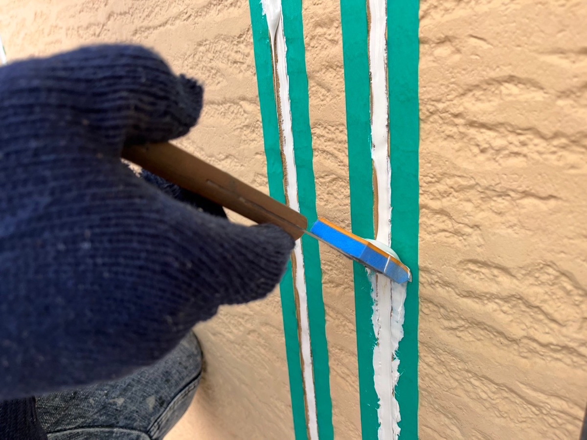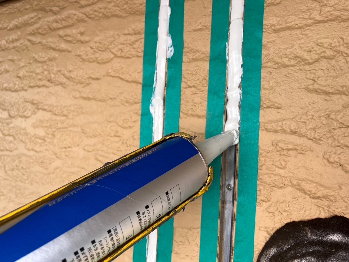 コーキング材の充填。目地内部に空洞ができないように多めに注入していきます。
