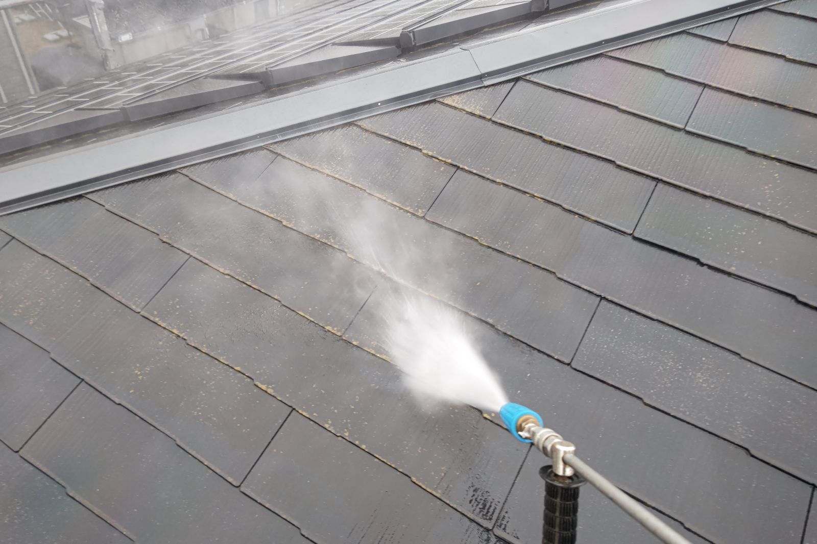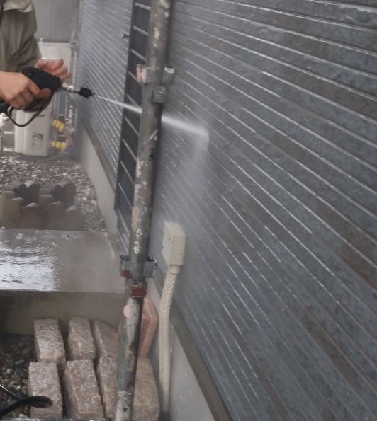 塗料と建材の密着を強くするために外壁や屋根に付着した埃・苔・汚れなどを隅々まで洗浄します。